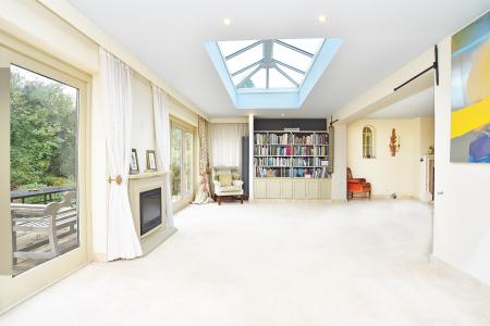 The lounge flows effortlessly into a large sitting room featuring a lantern roof and two sets of bi-folding doors that open onto a sunlit elevated terrace, the perfect setting for relaxed entertaining. Adjoining is a contemporary breakfast kitchen and partially separated dining area, creating a sociable heart to the home.