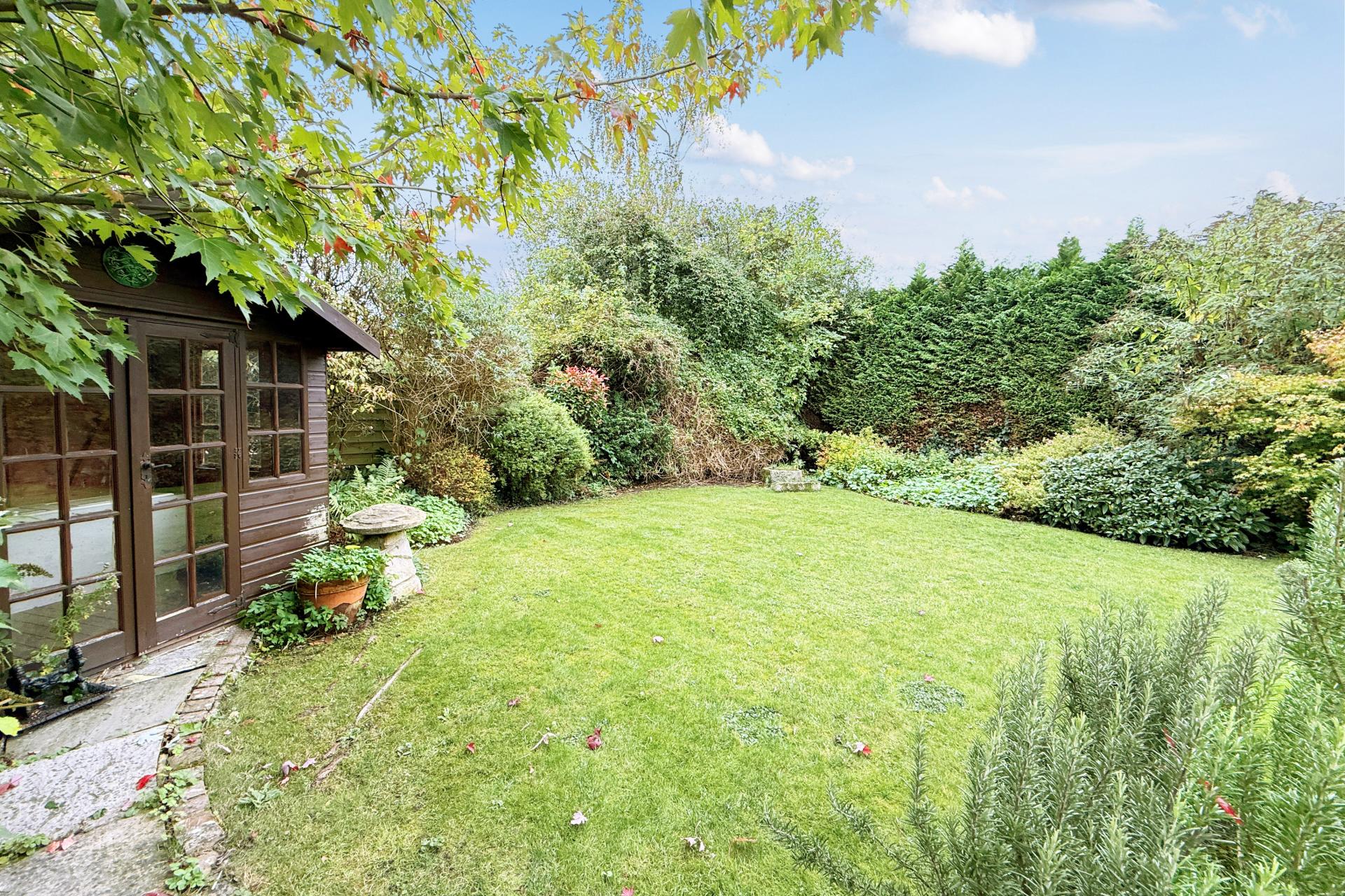 OUTSIDE To the front, a block-paved driveway provides ample off-street parking. The private south-facing rear garden is a true highlight, an inviting and tranquil space ideal for both entertaining and everyday enjoyment. A broad elevated terrace overlooks a shaped lawned garden with timber summer house, while steps descend to a gravelled area and further lawn with mature fruit trees. The property also benefits from a three-quarter height cellar (approximately 20' x 9'3'') with light and power, offering excellent storage or hobby space.