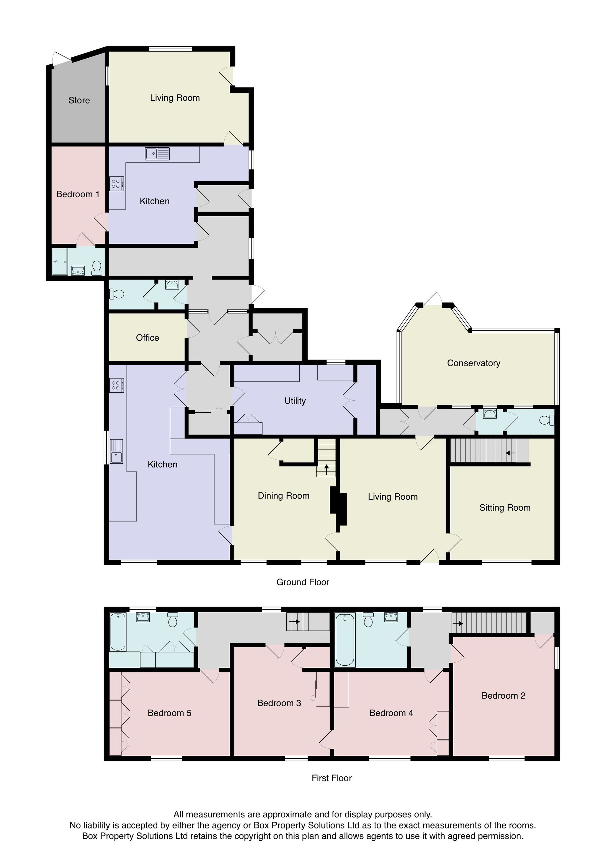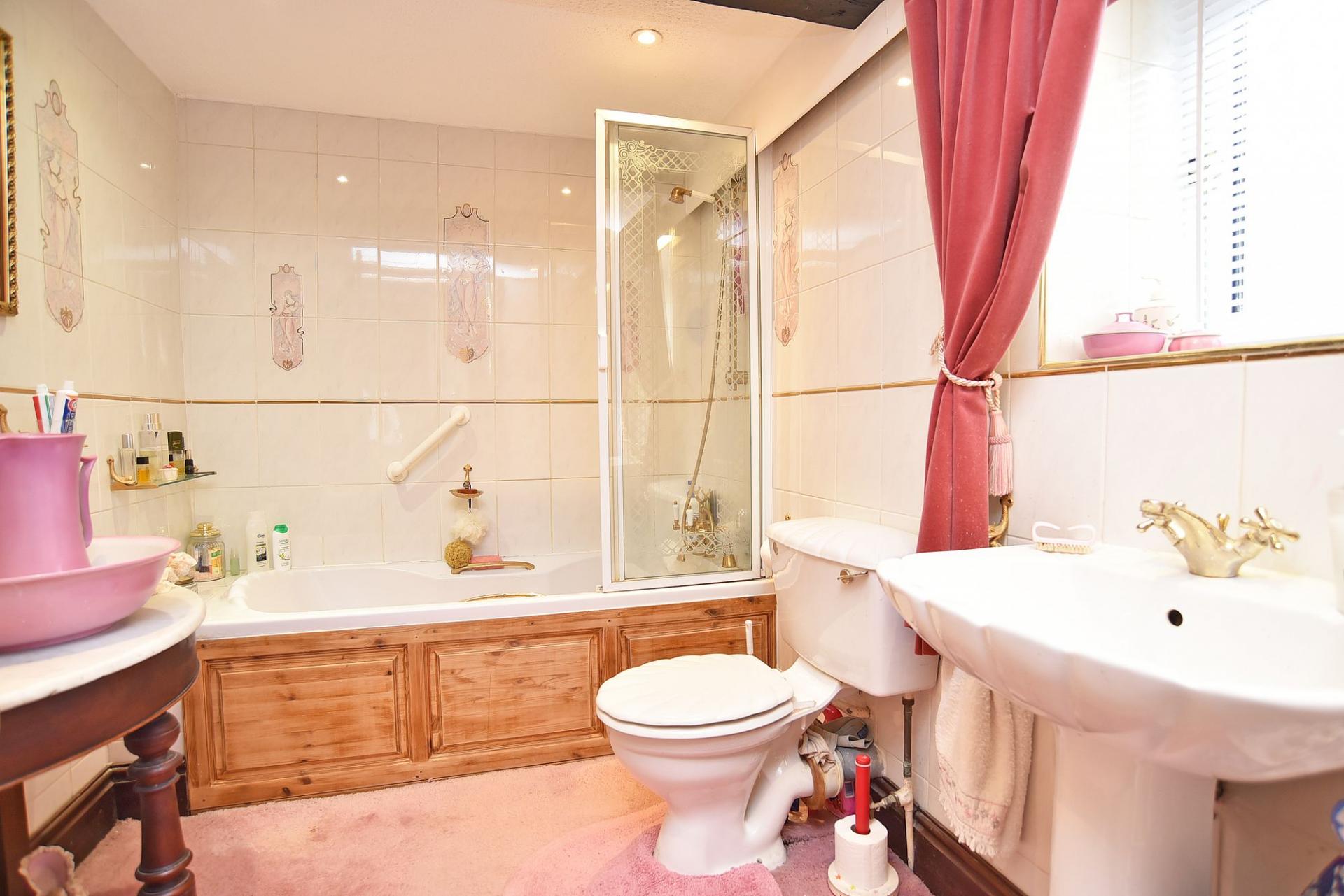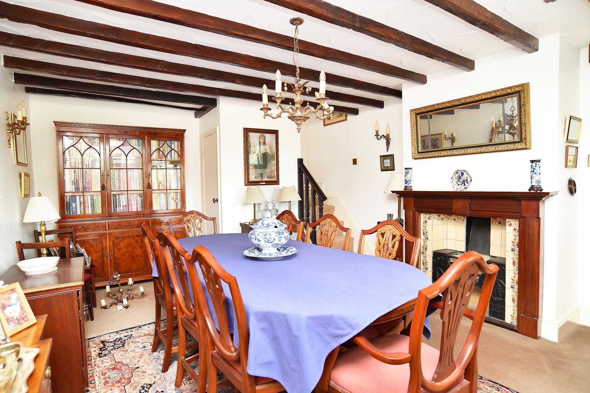 On the ground floor, the inviting entrance vestibule leads to a spacious living room with exposed beams and an impressive fireplace, creating a warm and welcoming atmosphere. A second sitting room, with electric fire, provides access to the first floor. The elegant dining room, with open fireplace, leads to a charming breakfast kitchen fitted with traditional units and centred around a classic Aga. Further ground-floor accommodation includes a conservatory, utility room, study, and guest cloakroom.