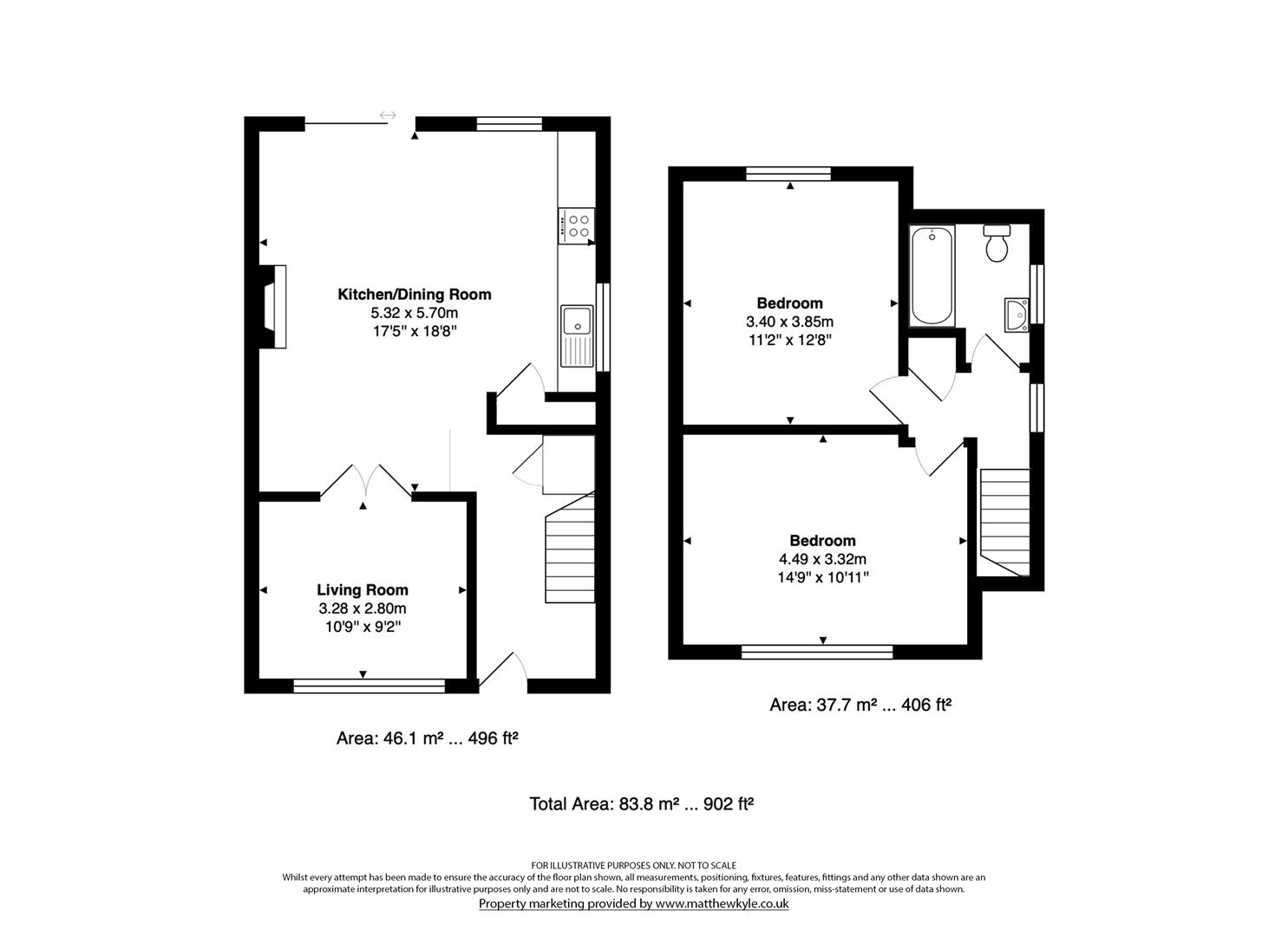 The ground floor accommodation comprises an entrance hall, a spacious open-plan kitchen/family room, and a separate sitting room. Upstairs, there are two generously sized bedrooms and a modern re-fitted bathroom.