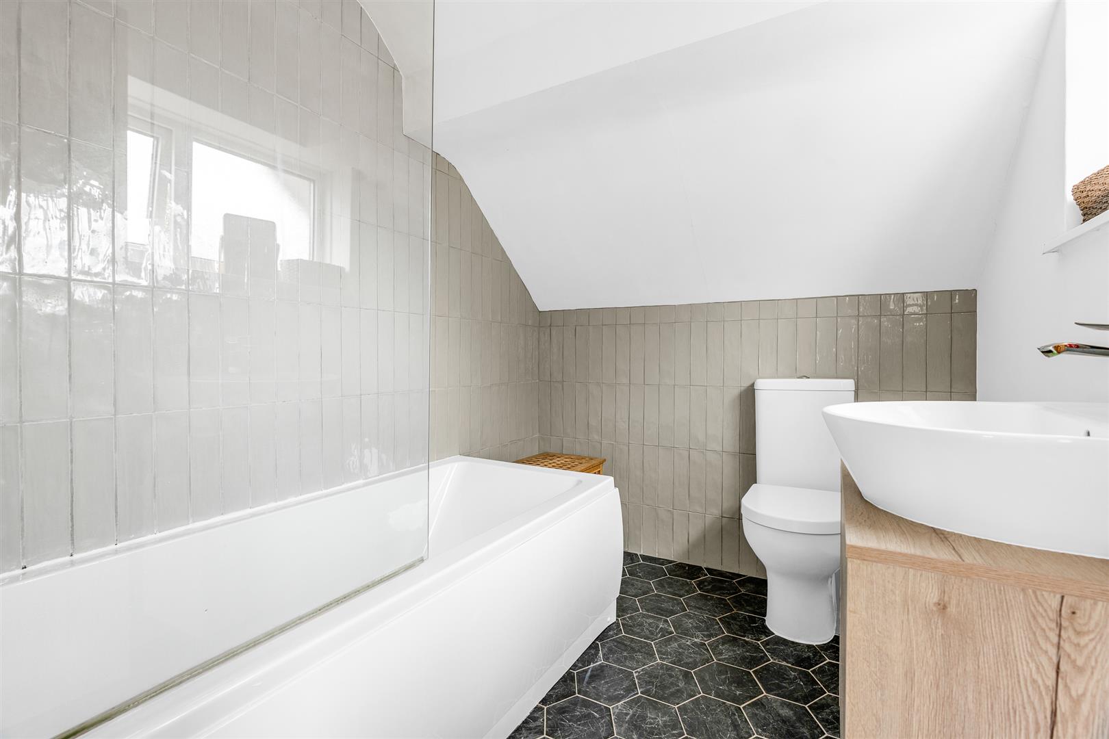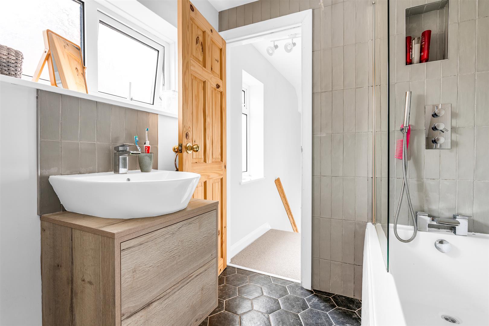 Re- Fitted Bathroom - Modern white bathroom suite comprising of a panelled bath, with a mixer tap, wall mounted mixer controls and overhead rainfall shower, low level WC, hand wash basin with a mixer tap, drawers under and tiled splash back, fully tiled to three walls, extractor fan, opaque double glazed window to side,
