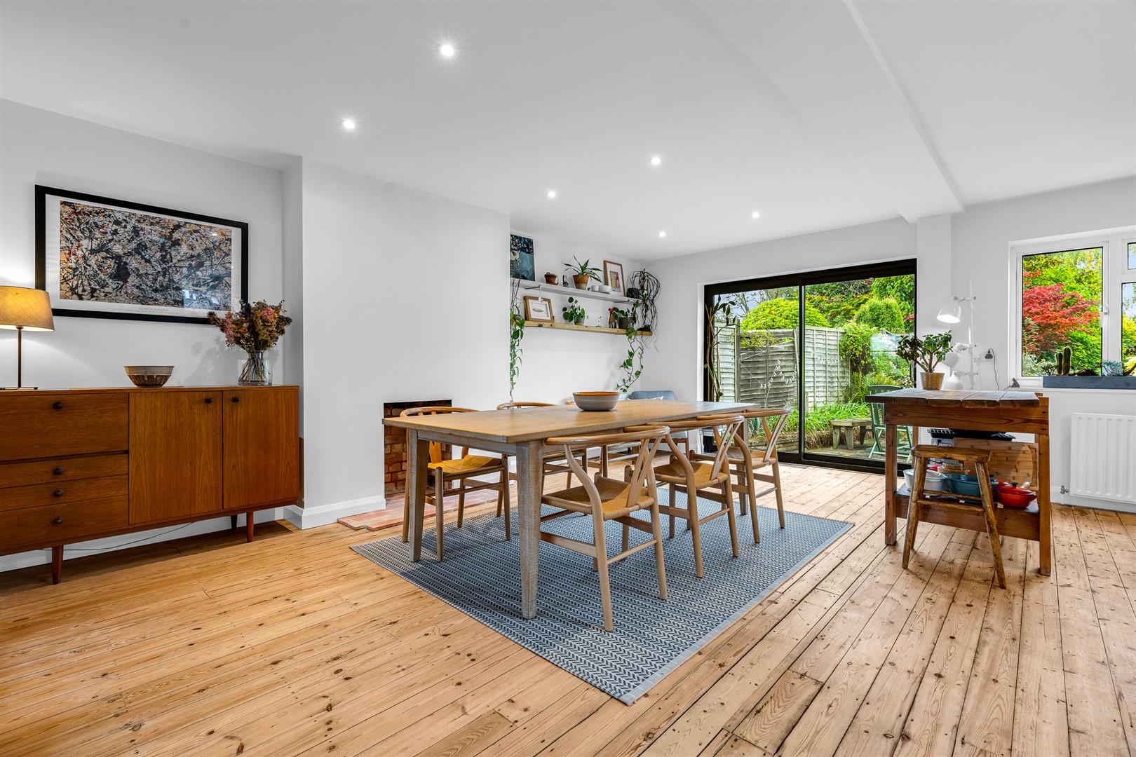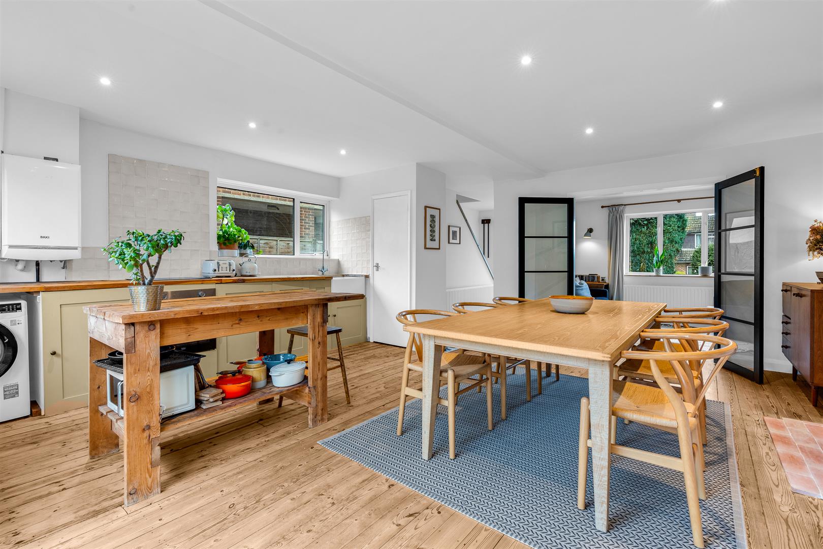 Open Plan Kitchen / Family Room - Re- fitted kitchen with fitted base units with cupboards and drawers, Butler sink with a swan necked mixer tap, built in larder cupboard, solid wood work top surfaces, integrated fridge, integrated freezer, plumbing for a washing machine, wall mounted ' Baxi' boiler serving central heating and hot water, insert ceiling spot lights, double glazed window to side, double glazed patio sliding doors opening rear garden, two radiators, open fireplace, exposed wooden floorboards.