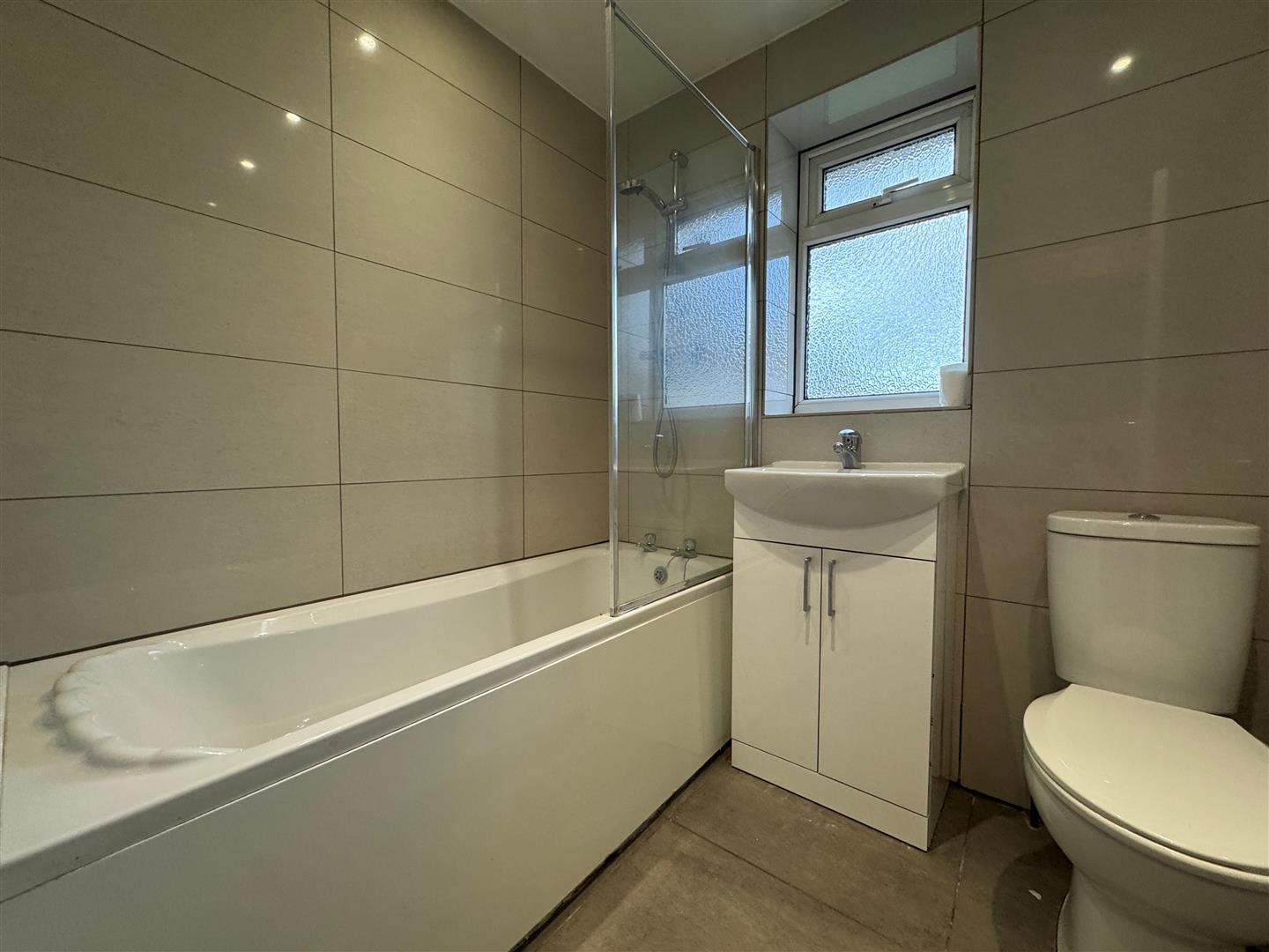 Bathroom - Modern white three piece bathroom suite comprising of a panelled bath, hand wash basin with mixer tap, low level WC, inset ceiling spotlights, shower screen, fitted shower with mixer controls and attachment, tiled walls,