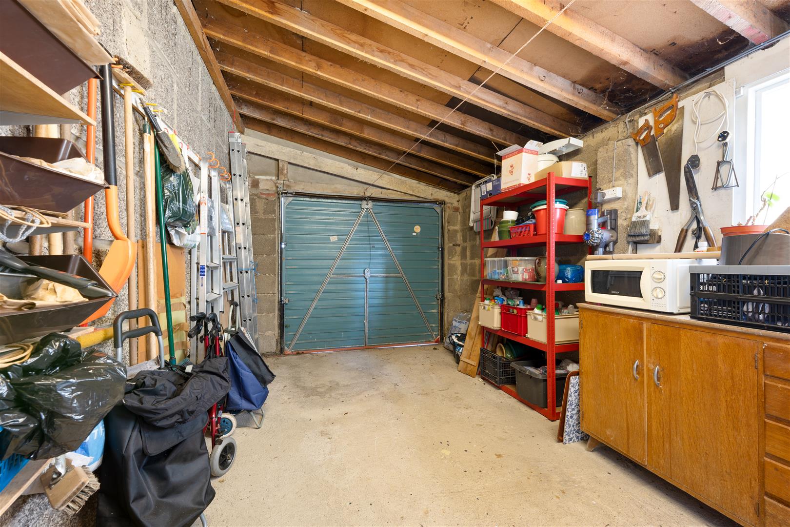 Basement - Concrete floor, fitted shelves, boiler, external window and door providing access to stone steps up to garden.