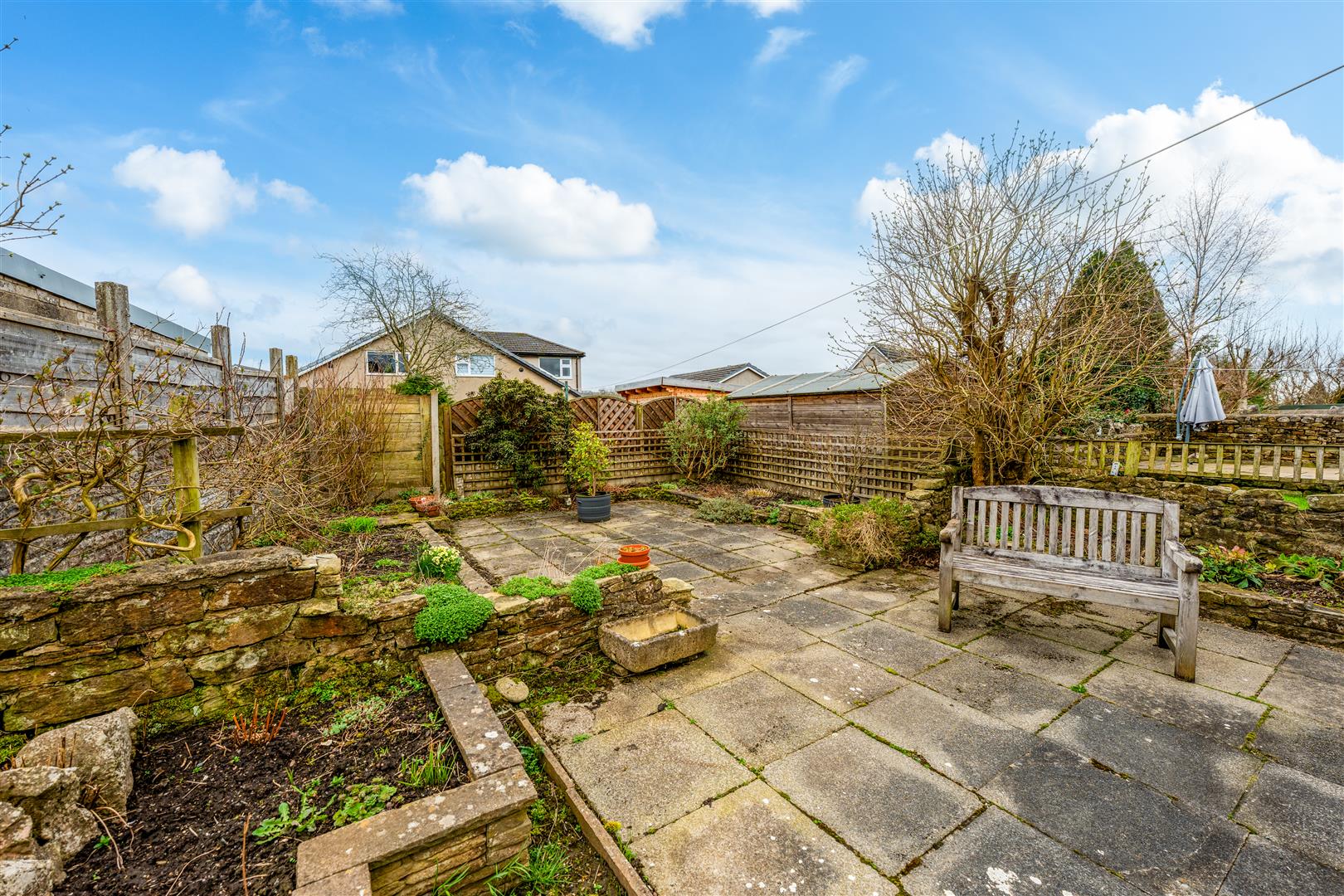 Rear - Good sized enclosed flagged patio garden, established flower beds.