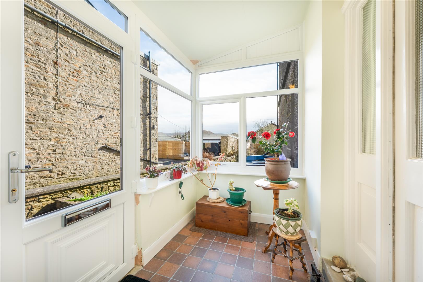 The entrance porch leads to a welcoming hallway with access to the main ground floor rooms. The sitting room at the front benefits from a bright bay window, while a second reception room provides versatile living space. A bright rear sunroom, accessed from the garden, offers a peaceful space to relax and enjoy the outdoors.