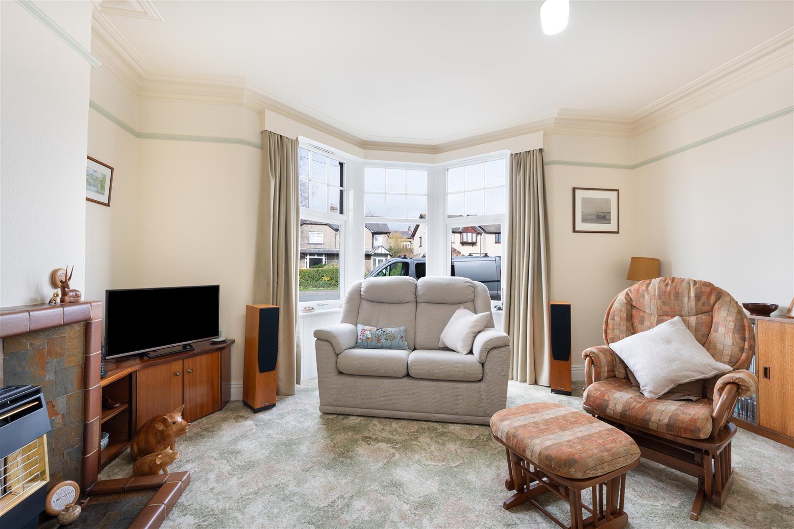 Sitting Room - Fitted carpet, radiator, fireplace with tiled hearth and surround housing gas fire, cornicing, picture rail, double glazed bay window to front aspect.