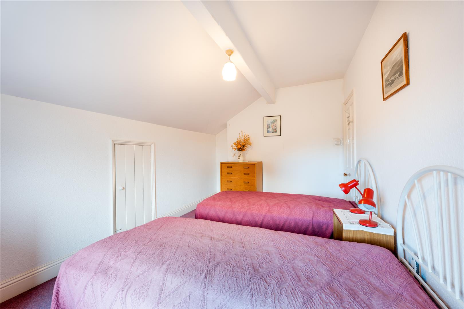 Bedroom Three - Fitted carpet, fitted cupboard, eaves storage, exposed beam double glazed window to side aspect.