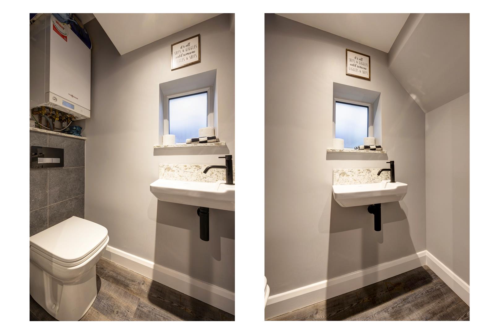 Cloakroom - Wood laminate flooring, wash basin, toilet, boiler, double glazed window with privacy glass to side aspect.