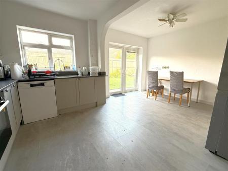Breakfast Kitchen - 5.13m x 3.66m (16'10 x 12'0) - A generous family orientated space which has recently been upgraded with a refitted contemporary kitchen finished with Shaker style door fronts in heritage colours, having granite effect laminate preparation surfaces, inset sink and drain unit with articulated mixer tap, integrated appliances include electric hob with chimney hood over and single oven beneath and plumbing for dishwasher. The room is a good size and would accommodate a living/dining area benefitting from French doors leading out into the rear garden and having two ceiling light points, attractive stone effect tiled floor, UPVC double glazed window and French doors.