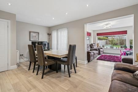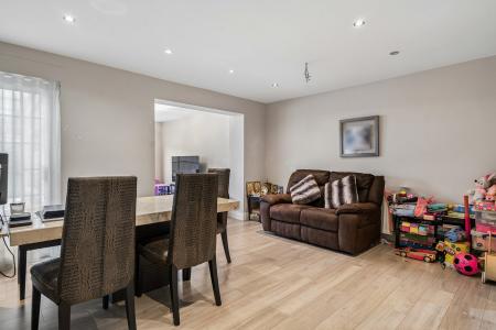 The ground floor features a bright and spacious living/dining room, ideal for entertaining, along with a contemporary fitted kitchen offering ample storage and workspace as well as additional seating at the breakfast bar as well as intergrated appliances including dishwasher, washer/dryer, fridge freezer, oven and microwave. To the rear, a separate family room provides additional versatile living space, perfect as a playroom, or snug.