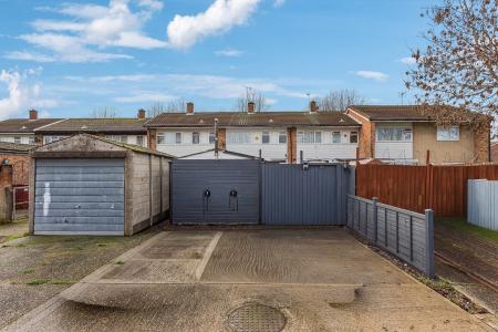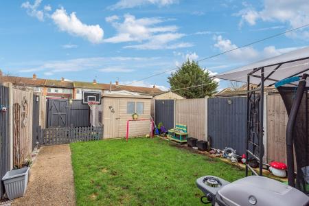 Externally, the property benefits from both front and rear gardens. The rear garden is mainly laid to lawn with a patio area ideal for outdoor dining and entertaining, and further benefits from excellent storage options, including a brick-built storage unit and an additional garden shed, providing ample space for garden furniture, tools, and equipment. Rear access leads to two allocated parking spaces.