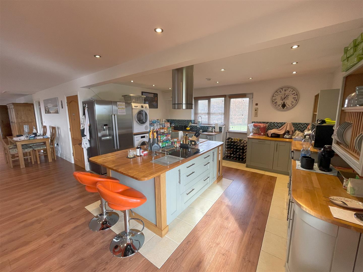 An enclosed porch gives access to a spacious entrance hall/ dining area with doors opening to all rooms. The hallway extends to an impressive, open plan kitchen comprising plenty of base cupboards, worksurface and central island. There is four ring hob located on the island, space for an American fridge freeze and space and plumbing for a washing machine and tumble dryer. The sink is ideally underneath the window overlooking the garden and a door gives outside access.
