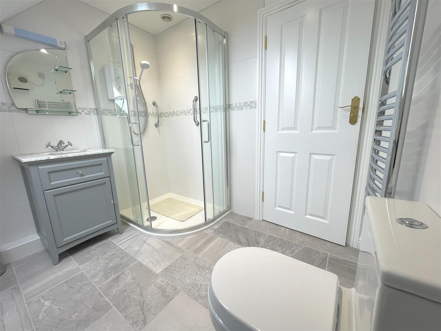 The bathroom is a generous size and made stylish yet practical with tiled walls and flooring. There is a bathtub, shower cubicle, wash hand basin, wc and heated towel rail.