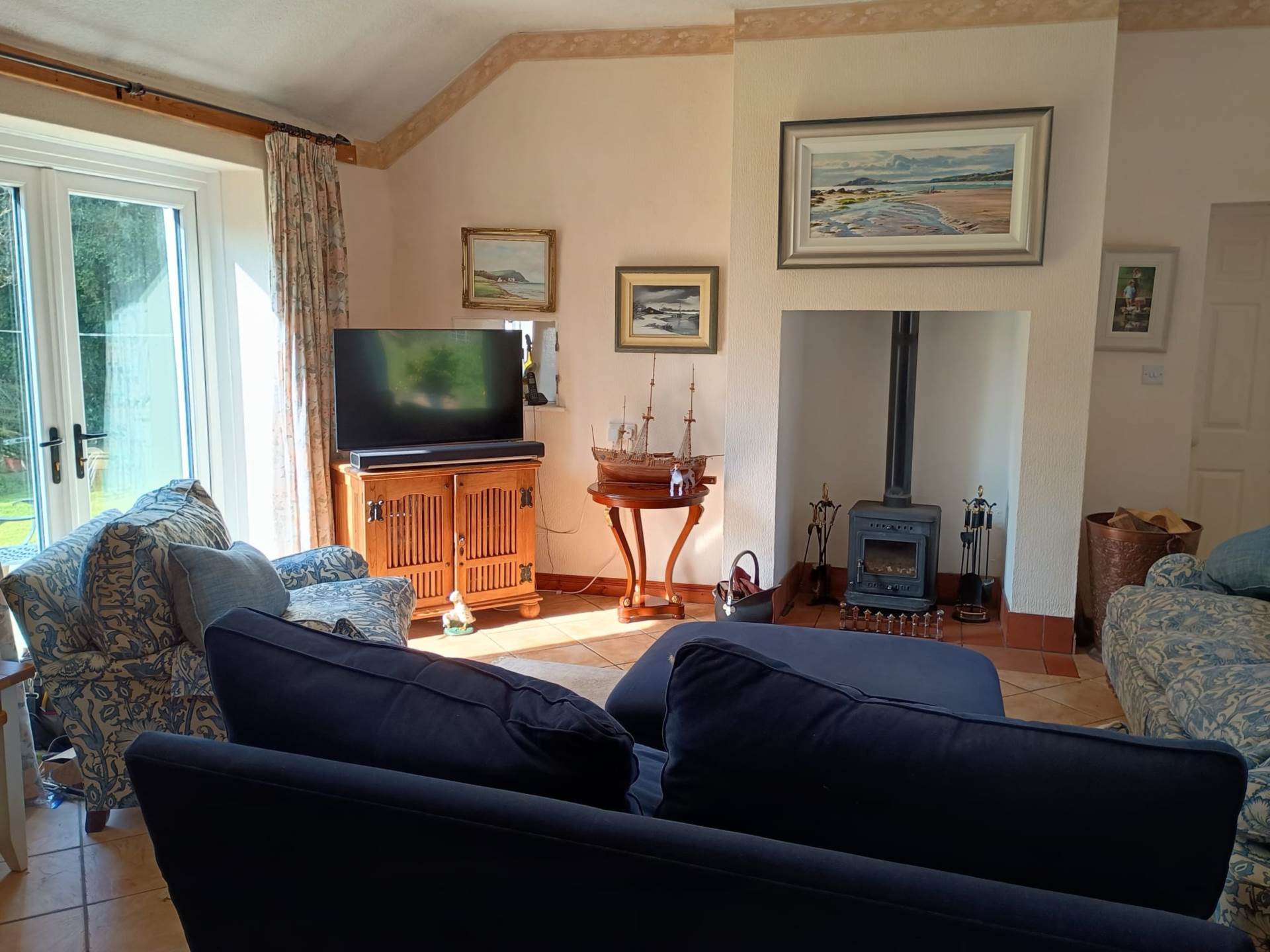 - Large lounge with feature wood burning stove and patio doors leading to the patio and mature garden