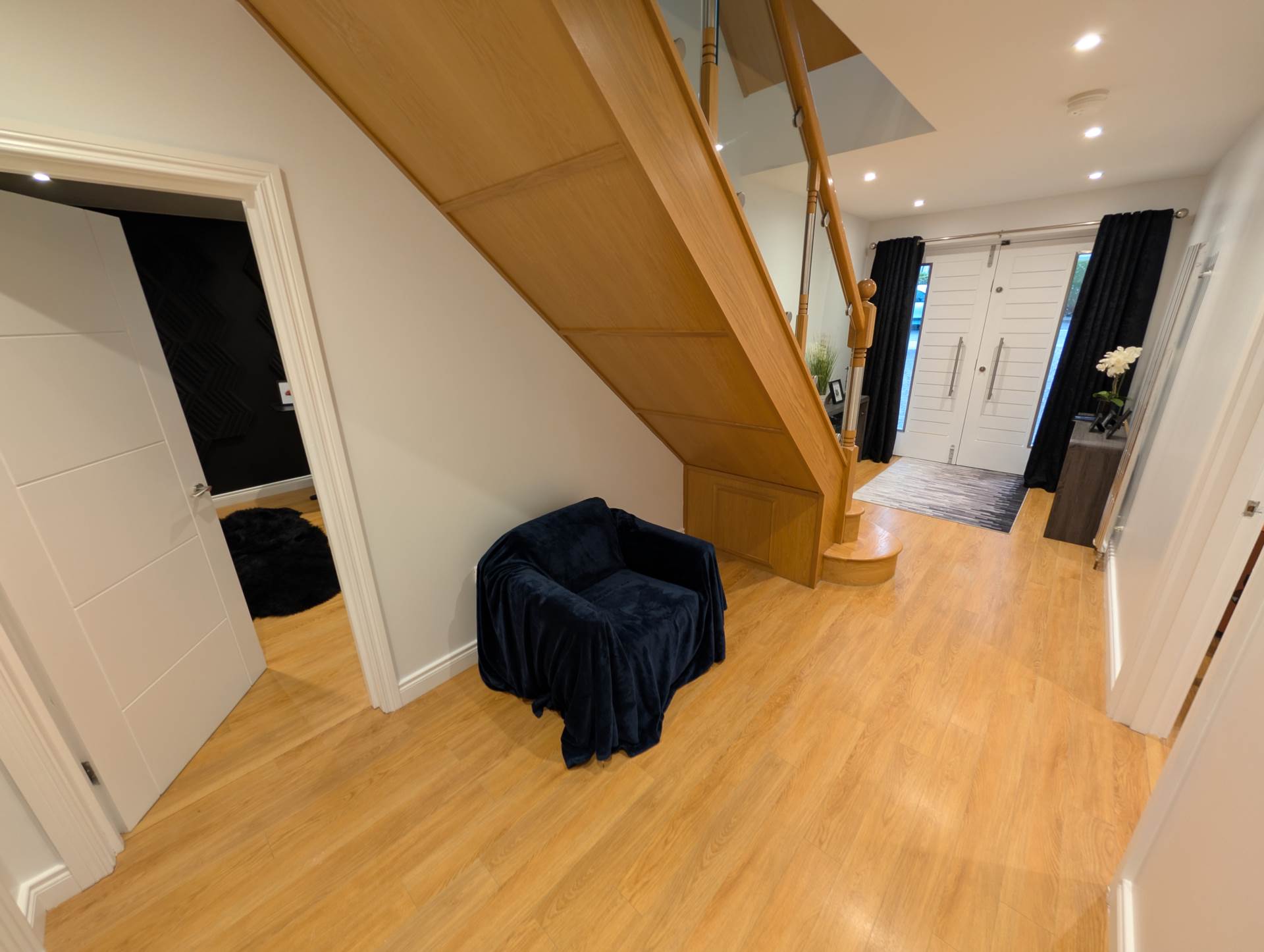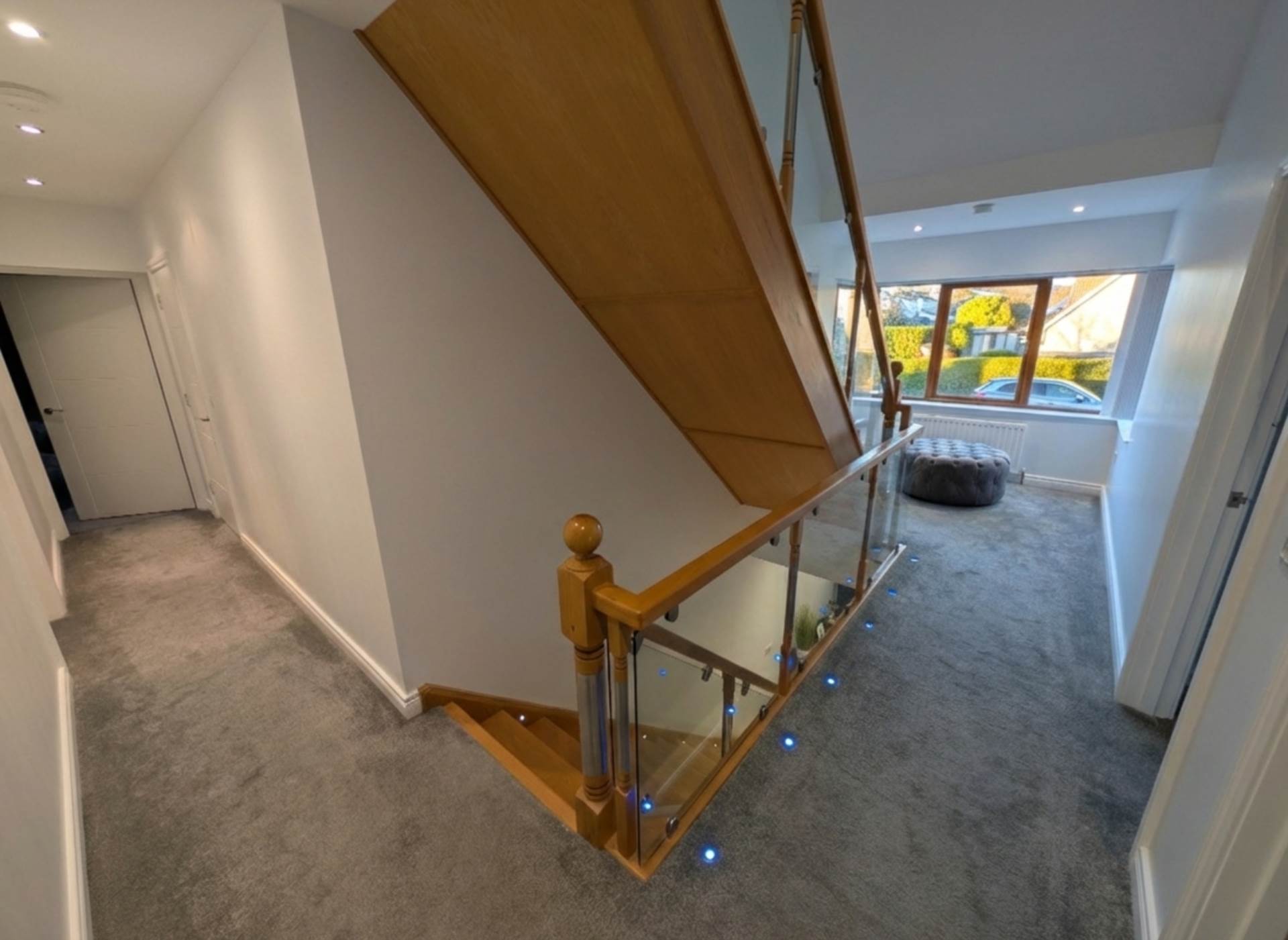 - Feature glazed and oak contemporary staircase with LED lighting leading to first and second floor