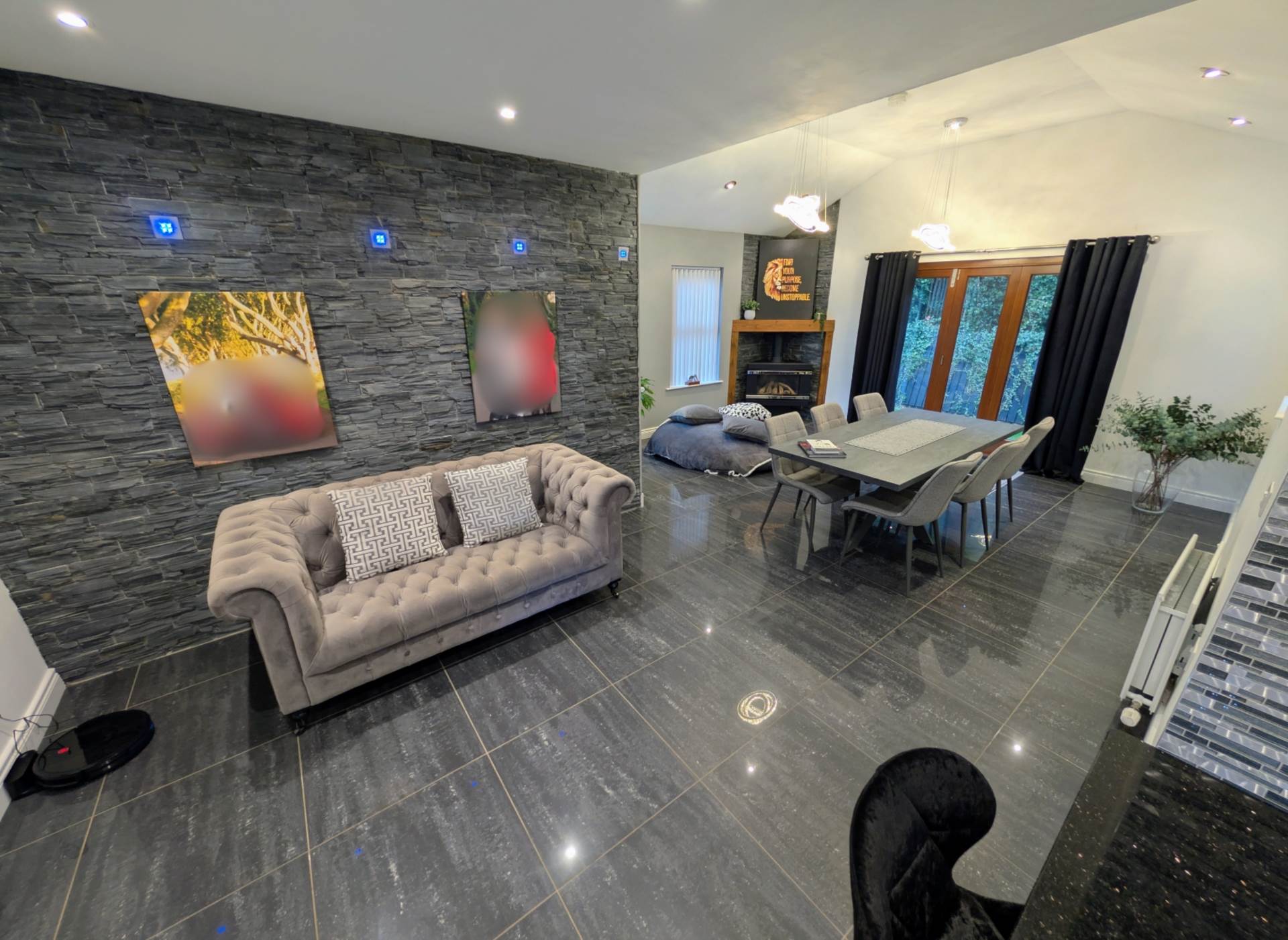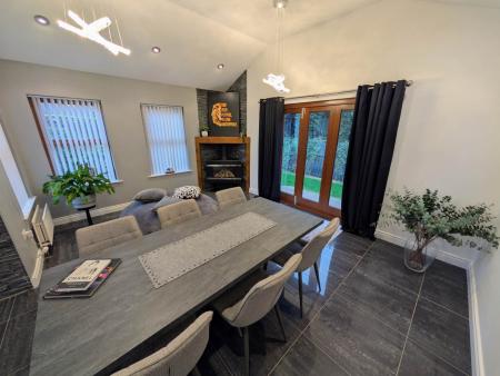 - Open plan kitchen / dining / family room with natural stone features