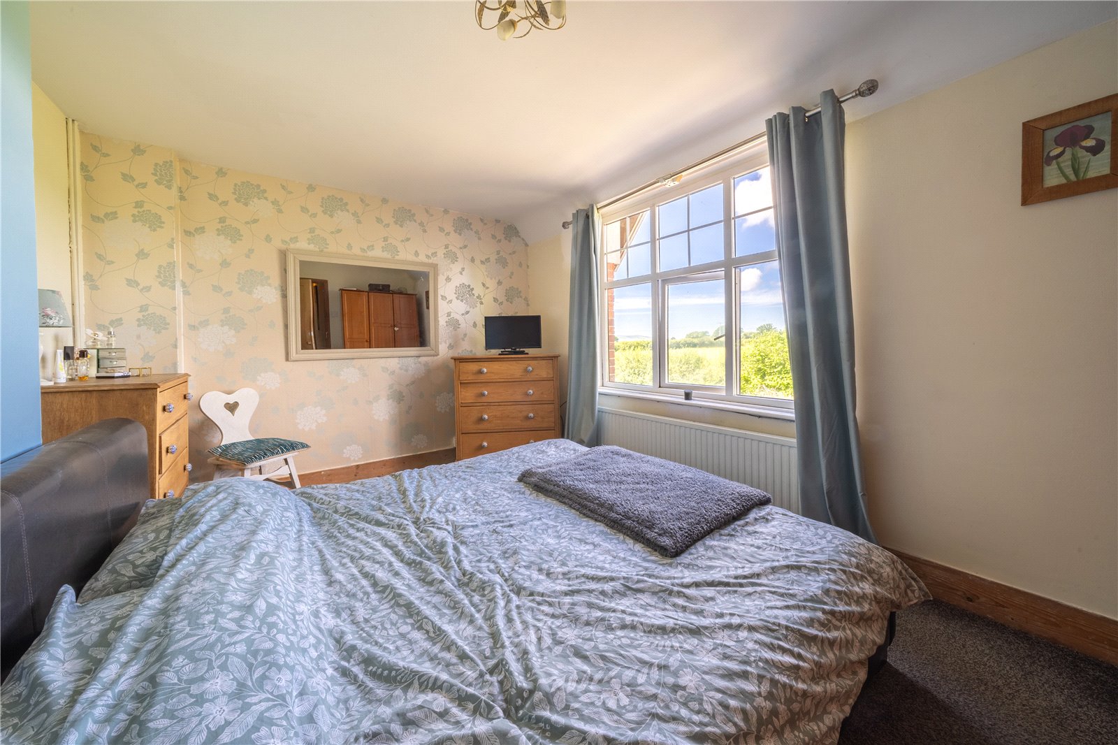 BEDROOM ONE: A double sized room with radiator, double glazed windows with aspect to side garden and far-reaching rural views beyond.