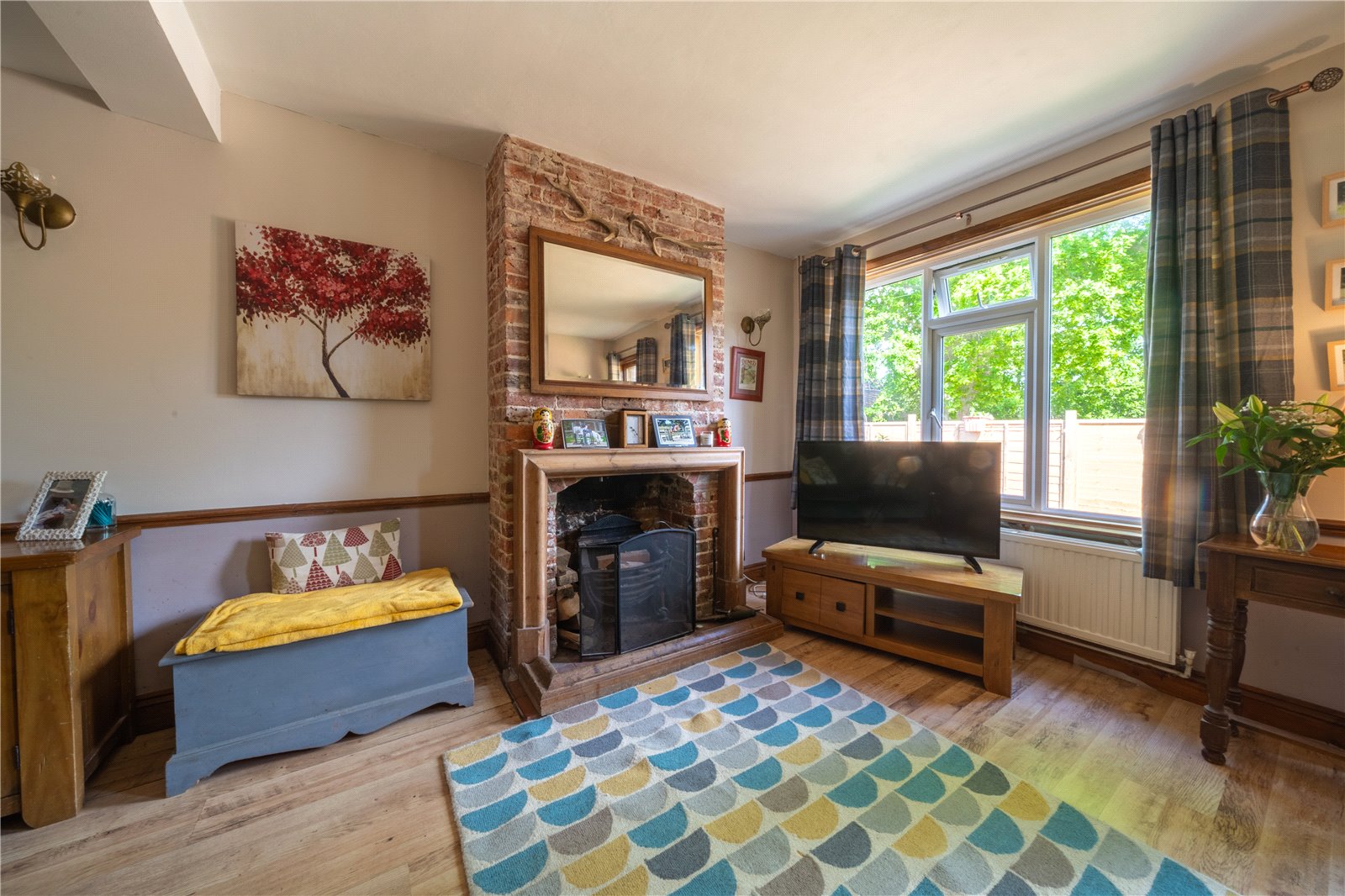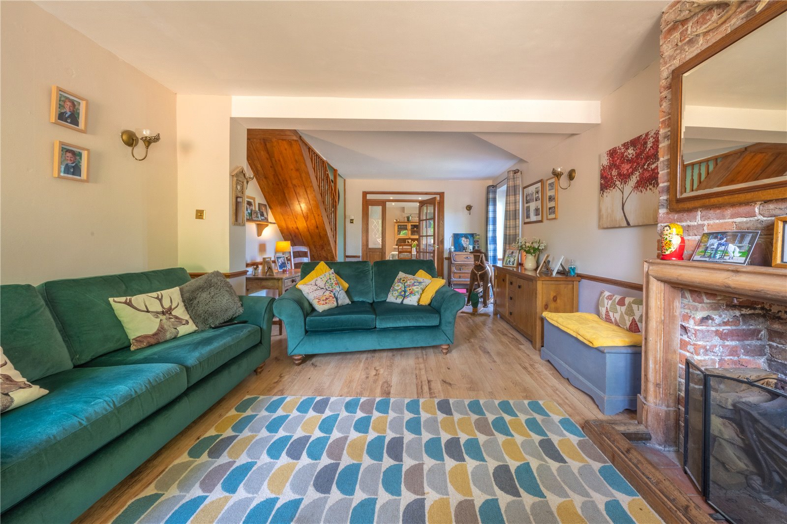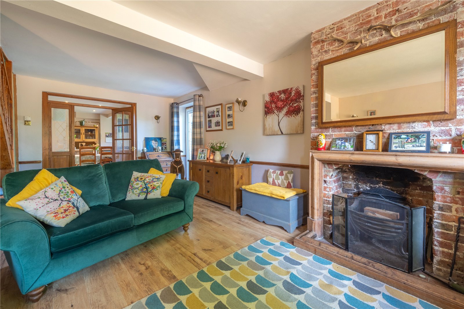 SITTING ROOM: A double aspect room with a feature fireplace, dado rails, radiators, double glazed French doors to outside garden, further double-glazed windows with aspect to the front garden, staircase leading to the first-floor accommodation.
