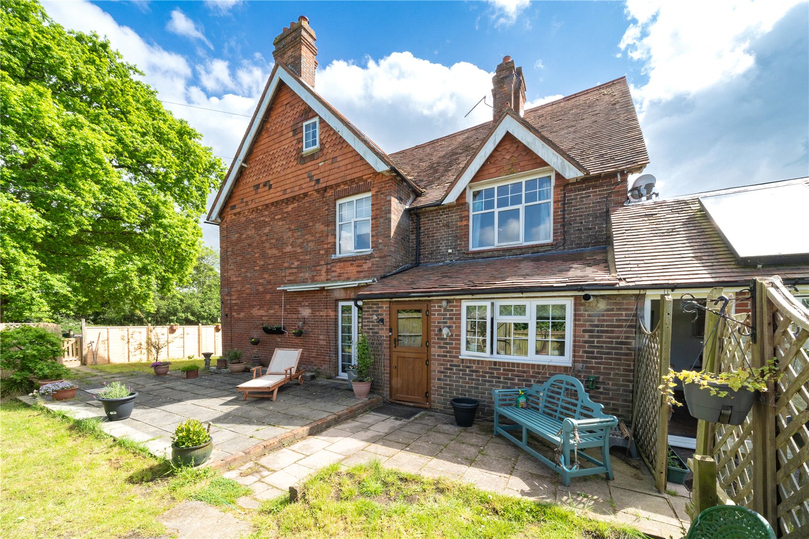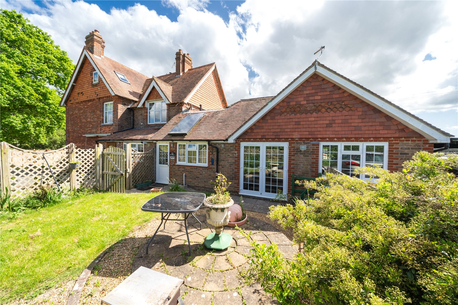 SIDE GARDEN: This comprises of a lawned area and sun terraces enclosed by high level slatted wood fencing and beyond is the side driveway off the private lane, which currently serves as the annex parking area.