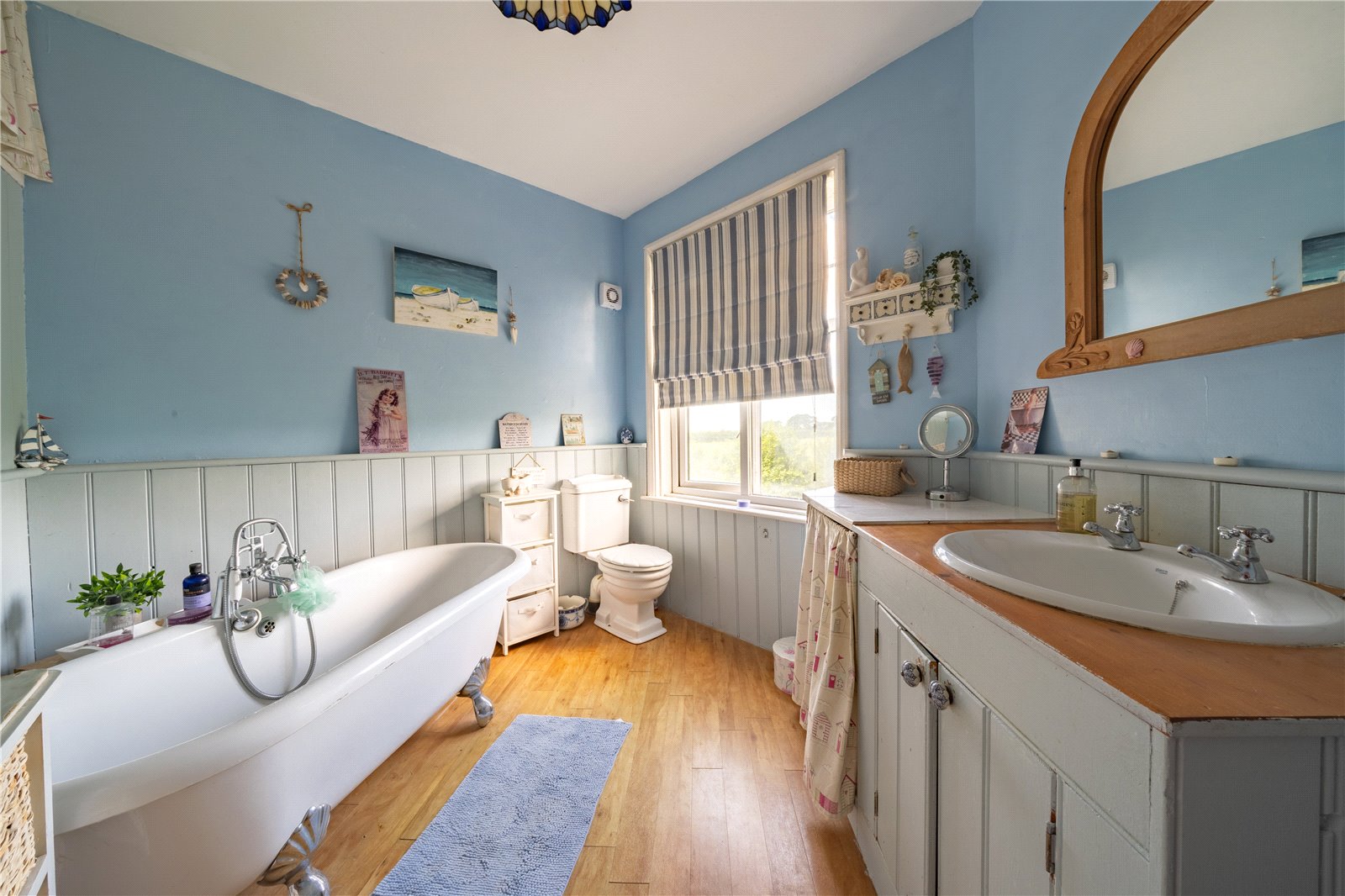 FAMILY BATHROOM: Comprising of a feature roll top Victorian style bath, W.C., fitted wash basin, half panelled walls, chrome heated towel rail, vanity unit, double glazed windows with aspect to side garden and far-reaching rural views beyond.