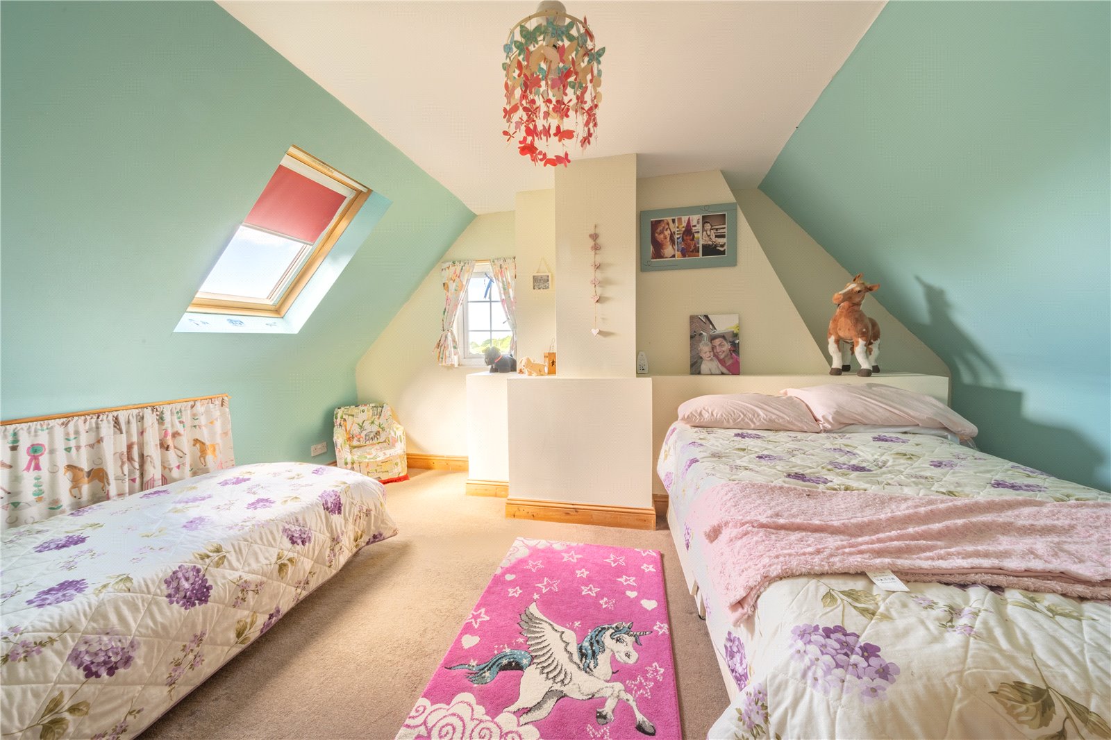 BEDROOM THREE: A double sized and double aspect bedroom with eaves storage areas, double glazed window with aspect to fields and far reaching rural views beyond, further side roof window with a similar view.