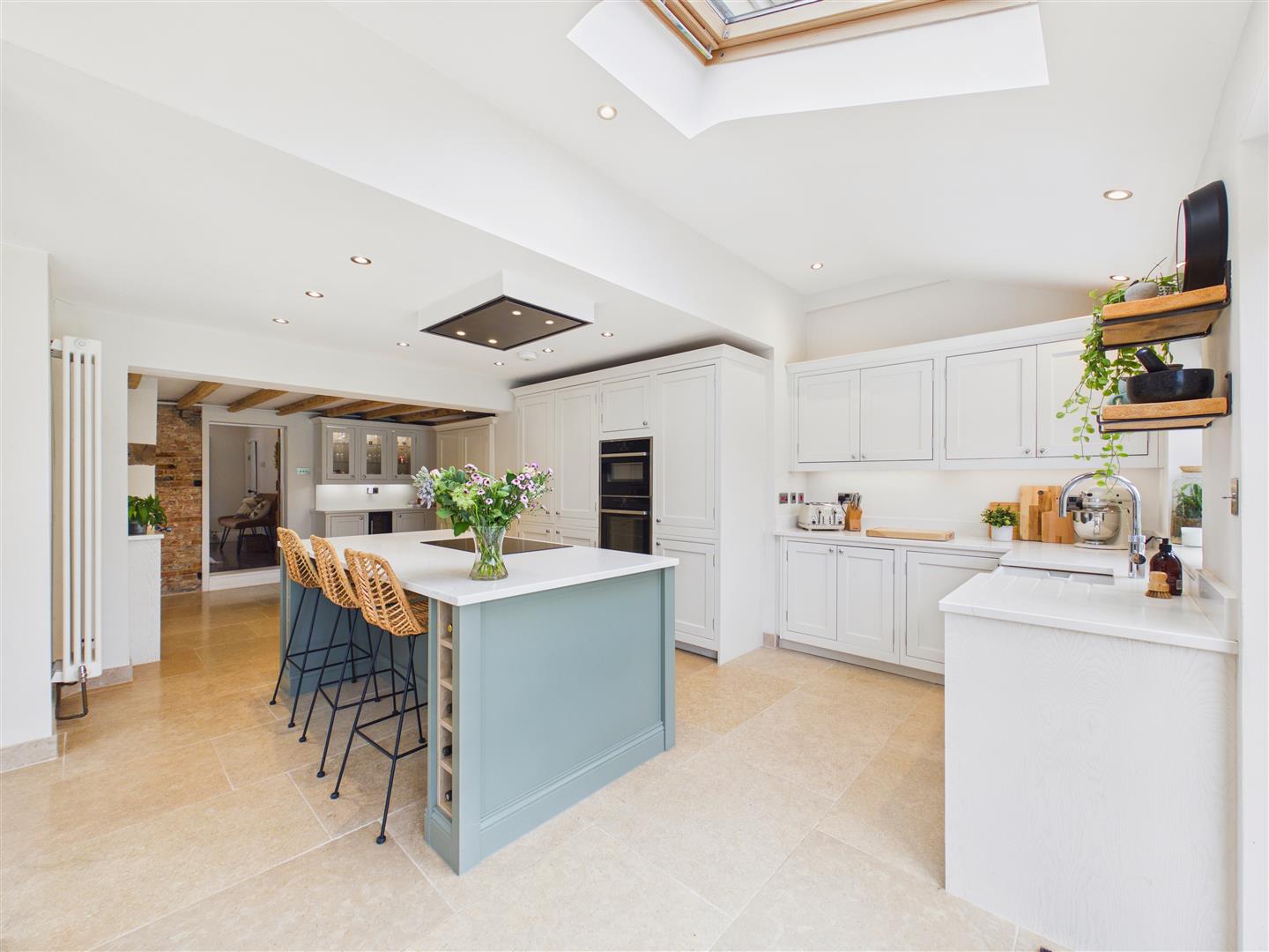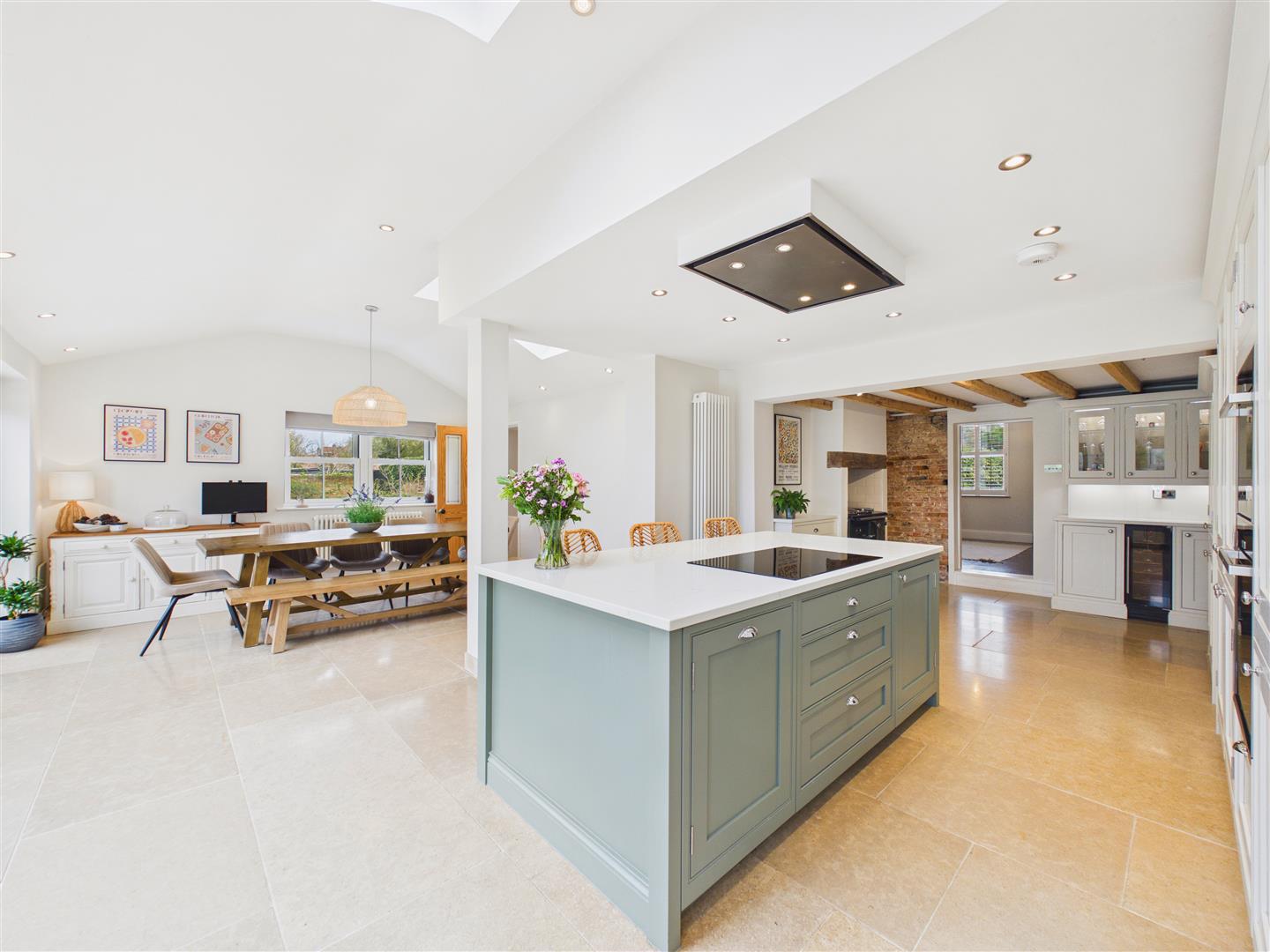 Equipped for the modern cook, the space features a Belfast sink with a Quooker boiling water tap alongside a comprehensive suite of integrated appliances. These include a five-ring induction hob with a sleek ceiling extractor, a combination microwave, and a primary oven, supported by a full-height larder fridge, freezer, and dedicated wine fridge. A traditional Esse cooker (currently disconnected) adds a touch of period charm to the room, which is finished with practical tiled flooring and recessed spotlighting throughout.