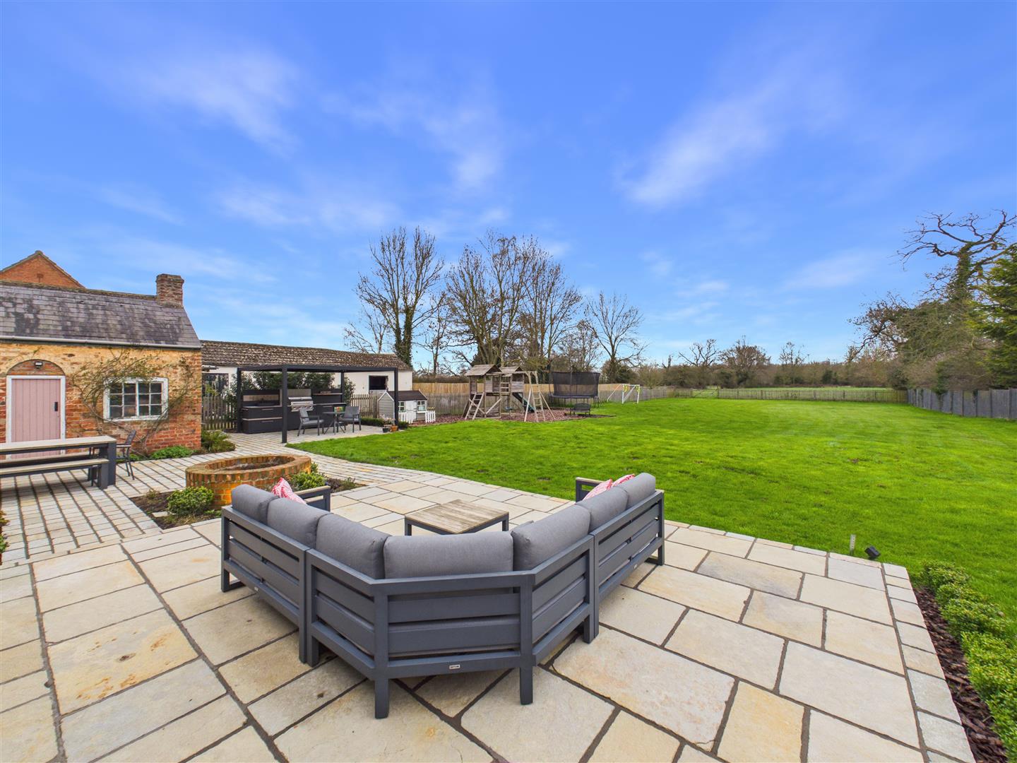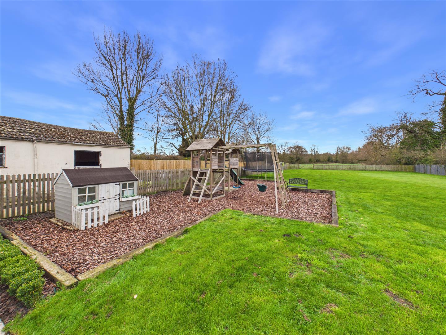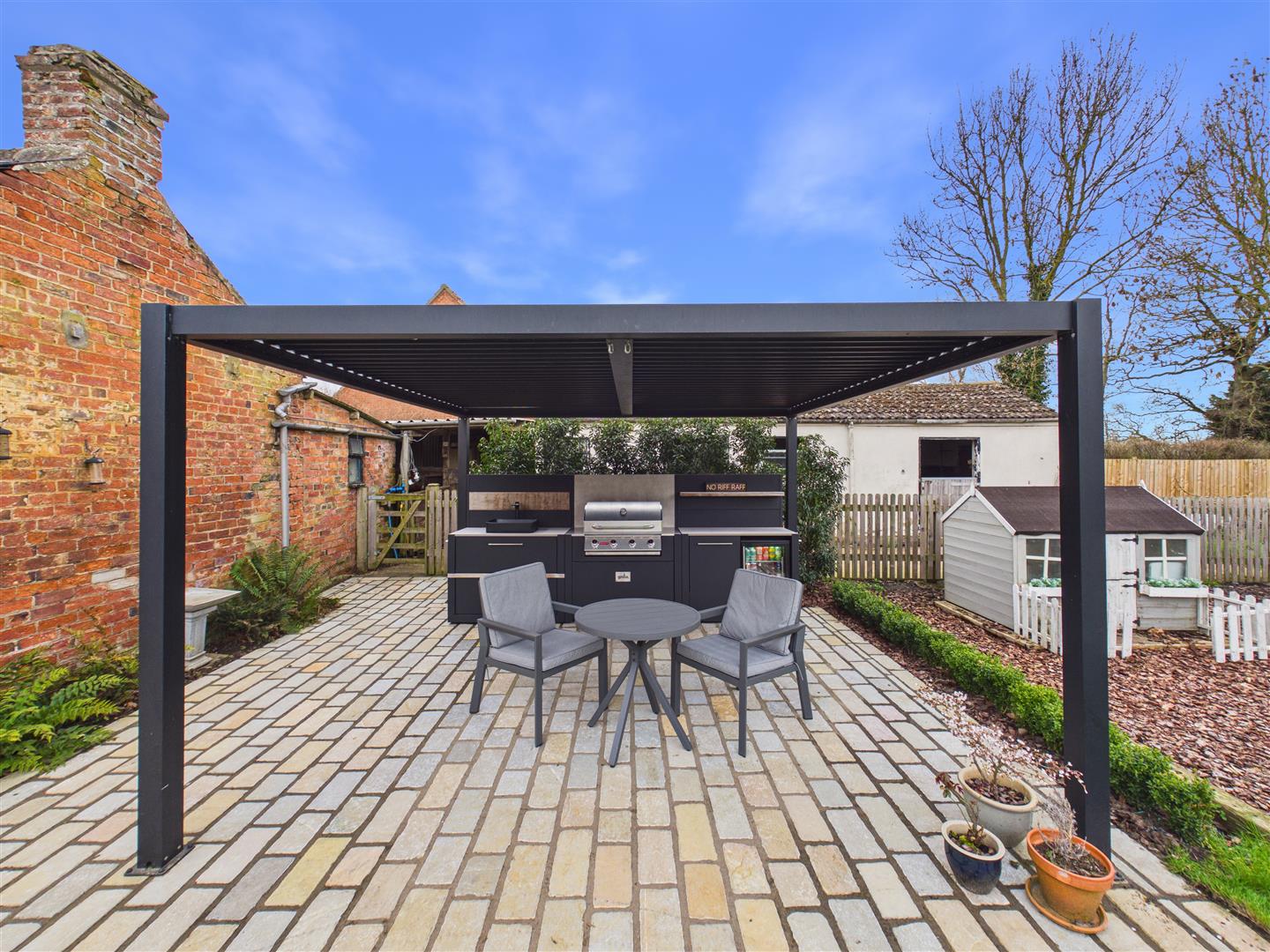 Outside - The property is set within approximately 2.2 acres of versatile grounds, offering a rare blend of formal gardens and functional land. The arrival is served by two practical gravelled driveways providing extensive off-road parking, one of which is beautifully framed by a mature magnolia tree. To the rear, the garden has been thoughtfully designed for outdoor living; an expansive patio features a fully equipped outdoor kitchen with a built-in BBQ, fridge, and sink. This leads onto a large lawn with a dedicated children's play area, with a farm gate providing direct access to the paddock beyond.