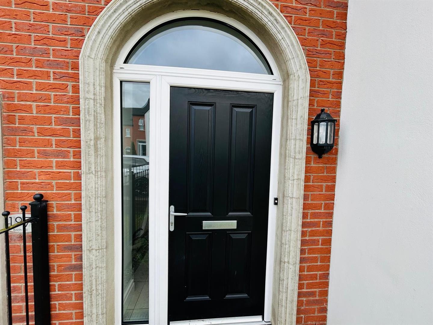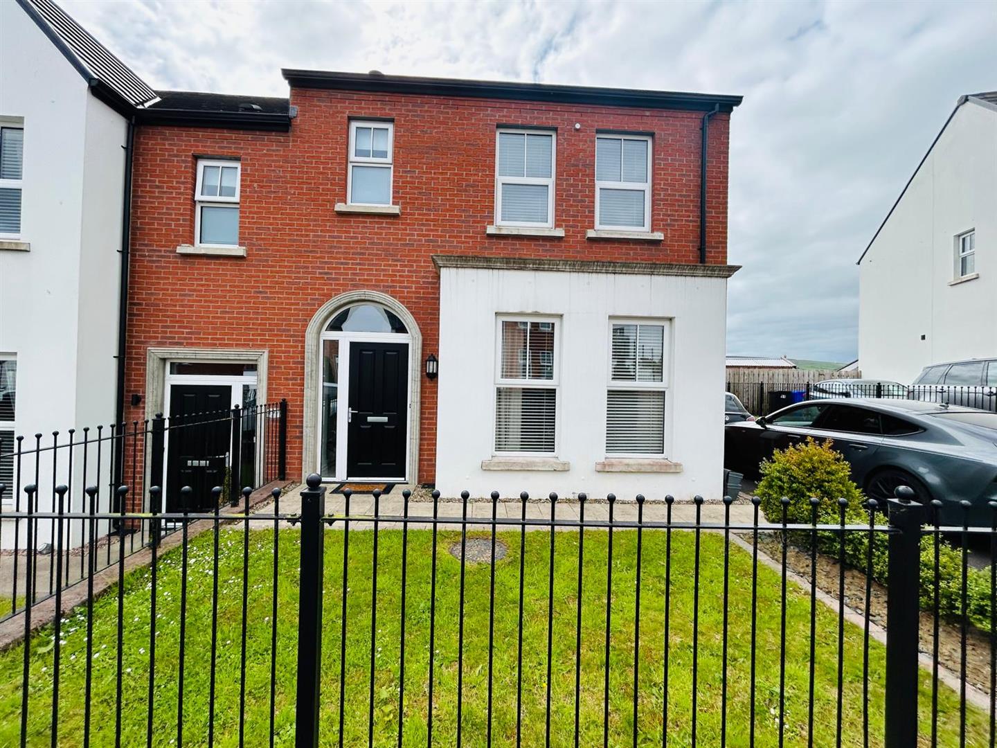 Neat lawn to front bordered by wrought iron fencing.