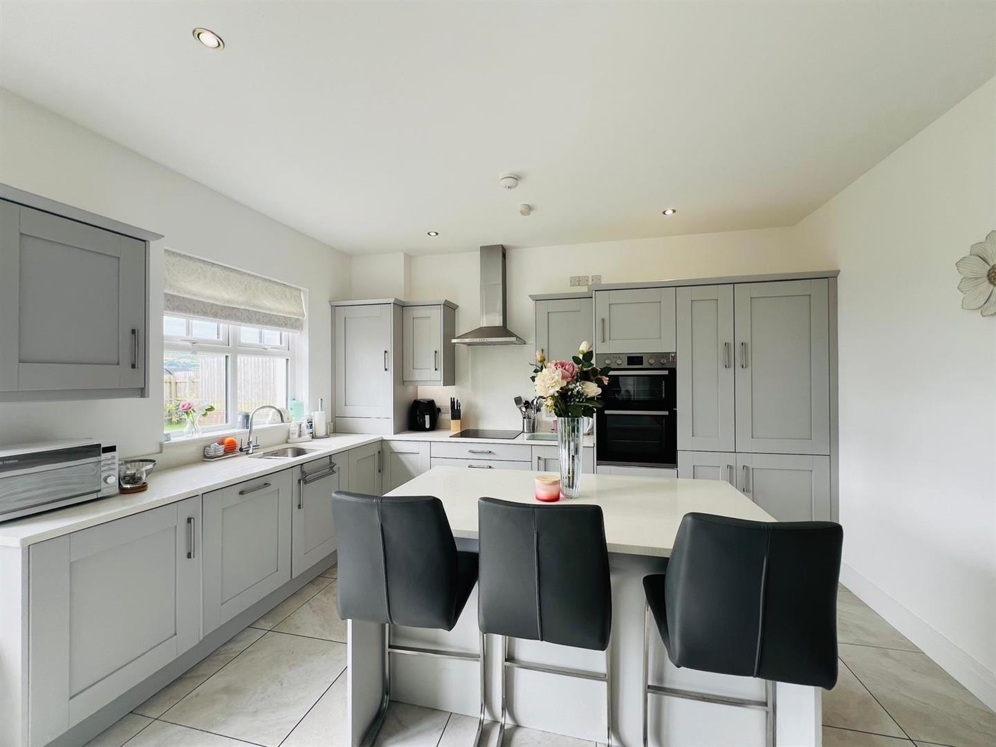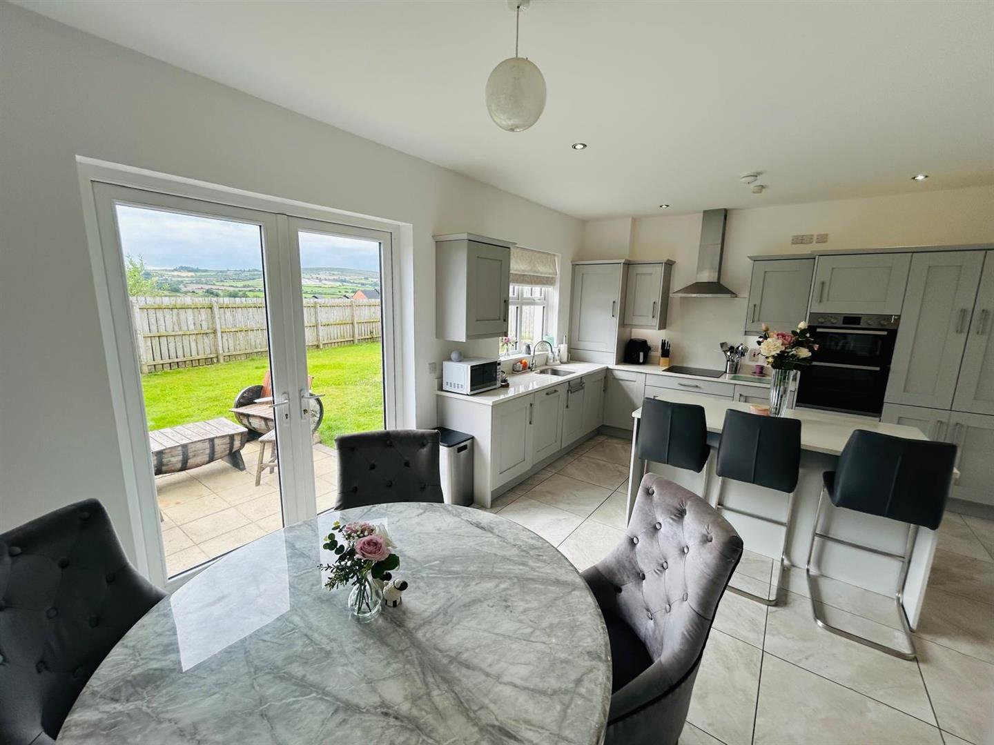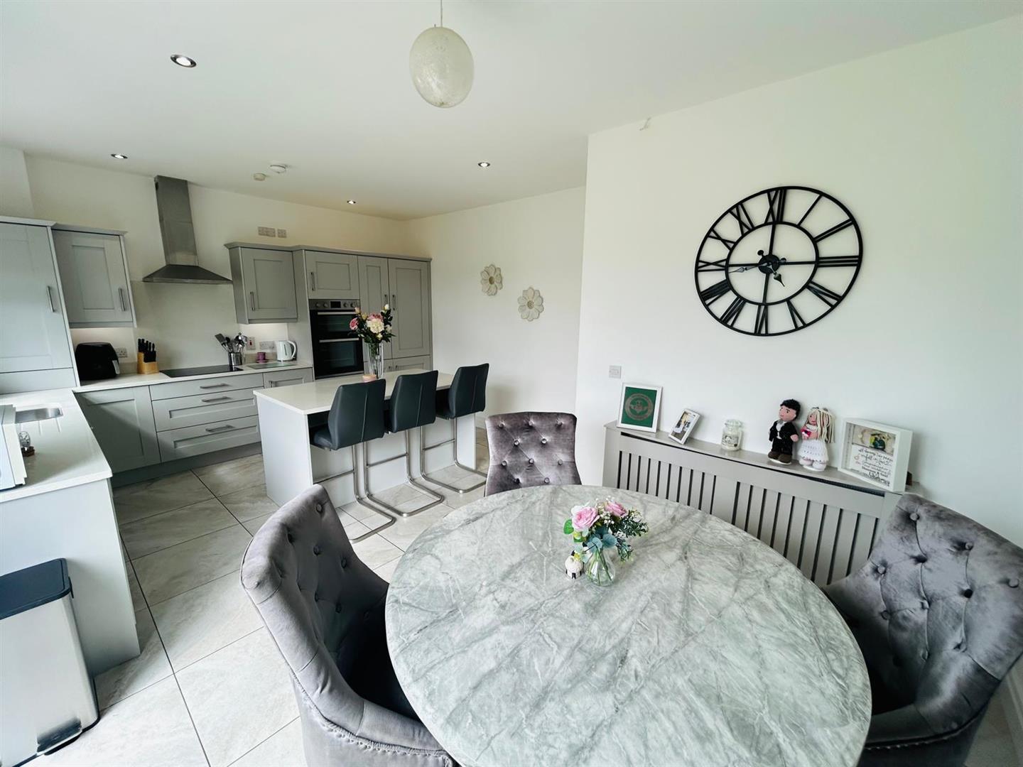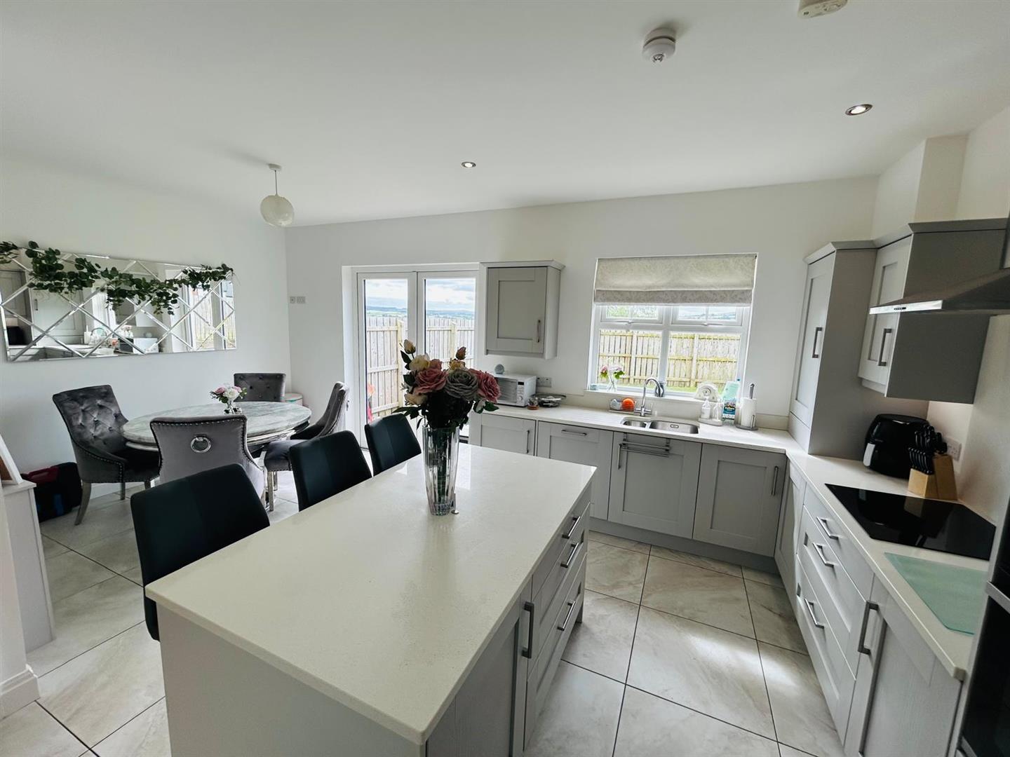 5.87m x 4.14m wp (19'3" x 13'7" wp) - Having excellent range of eye and low level units, stainless steel sink unit with mixer taps set in Quartz worktop, centre island with storage under, breakfast bar, hob, double oven, stainless steel extractor hood, integrated fridge / freezer and dishwasher, recessed lighting, dining space with French doors, tiled floor.