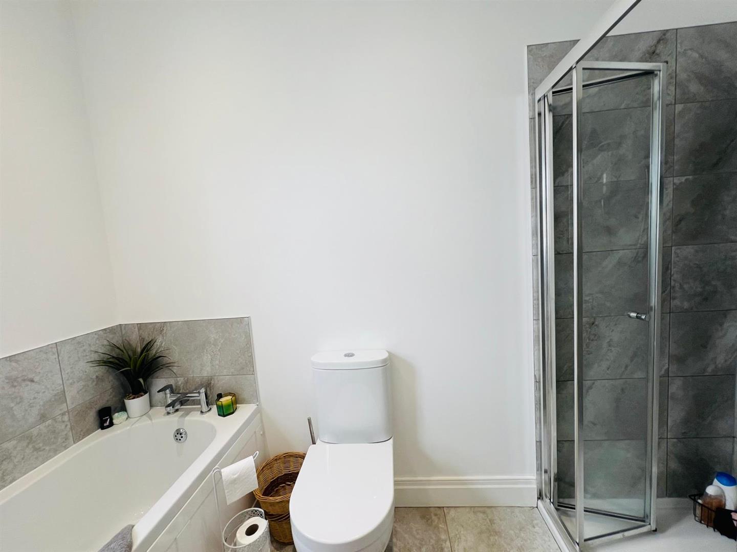 Comprising bath, tiled walk in shower, whb set in vanity unit, wc, recessed lighting, tiled floor.