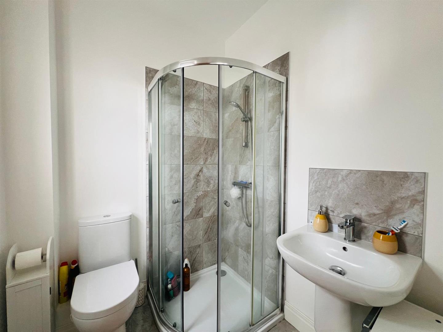 Comprising tiled walk in shower, whb and wc, tiled floor.
