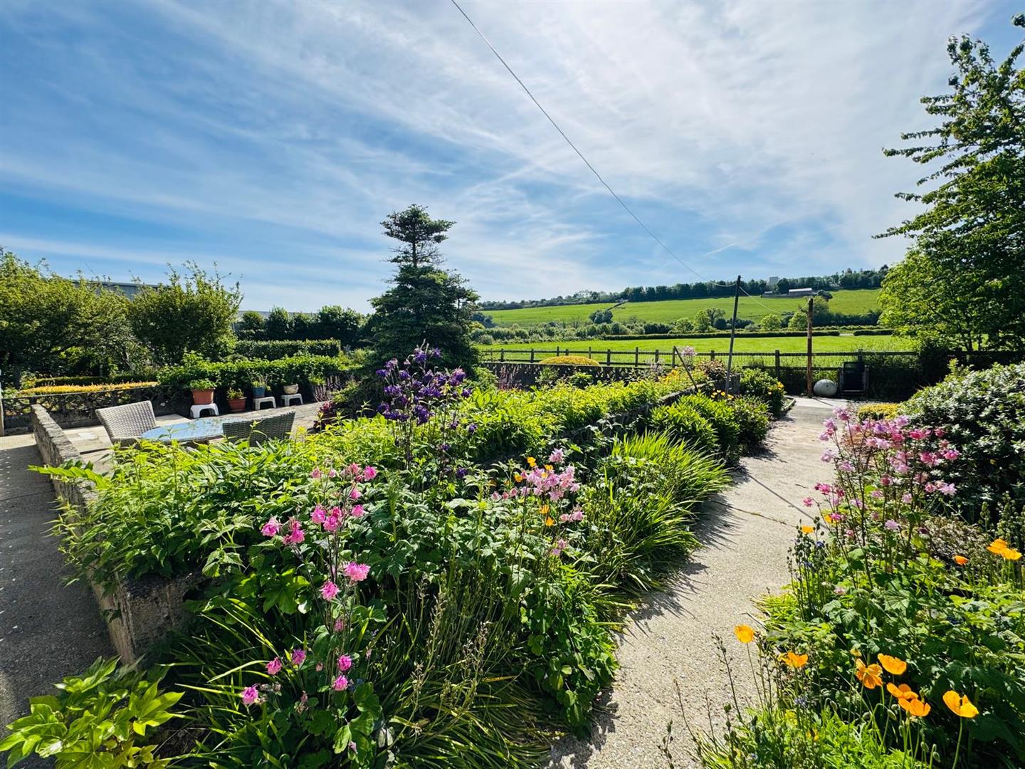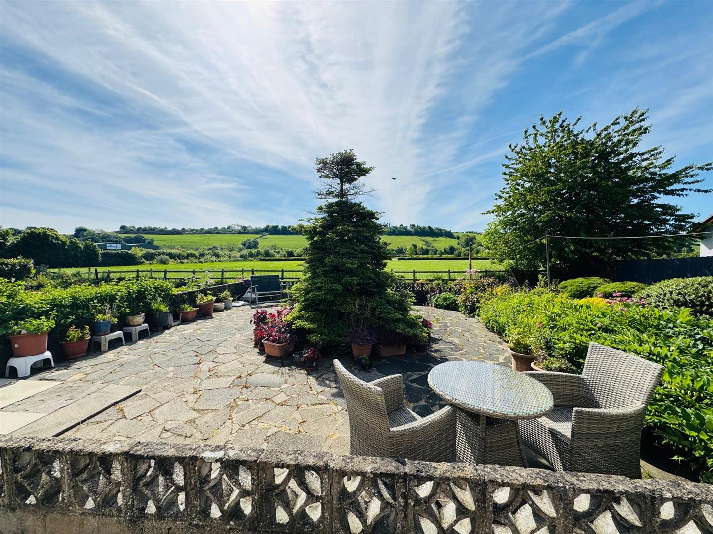 Beautifully manicured lawns to side and rear stocked with abundance of flowering plants, fruit trees and mature shrubs. Raspberry bushes, gooseberry bushes and apple trees.