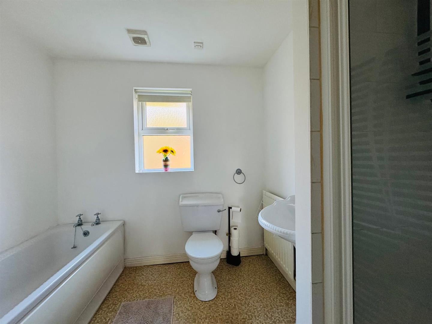 Comprising bath, fully tiled walk in shower, whb and wc.