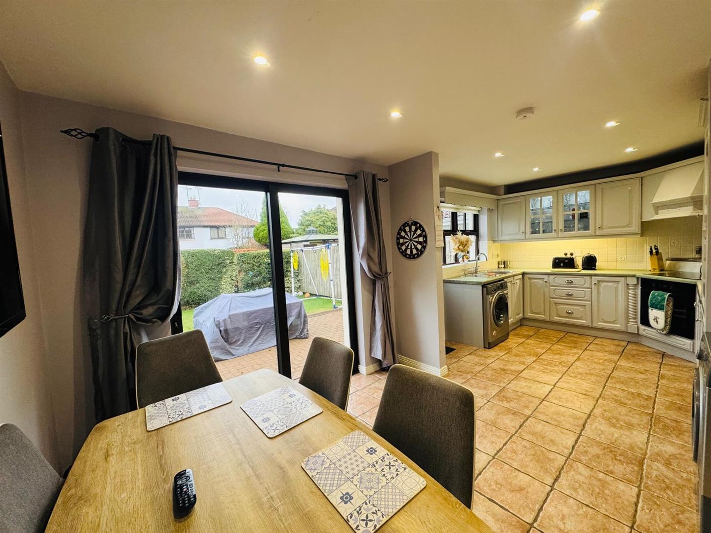 5.87m x 2.95m (19'3" x 9'8") - Having range of eye and low level units, tiling between units, 1 1/2 bowl stainless steel sink unit with mixer taps, hob, underoven, extractor hood, integrated fridge/freezer, plumbed for washing machine, recessed lighting, tiled floor, ample dining space with sliding patio doors to rear.