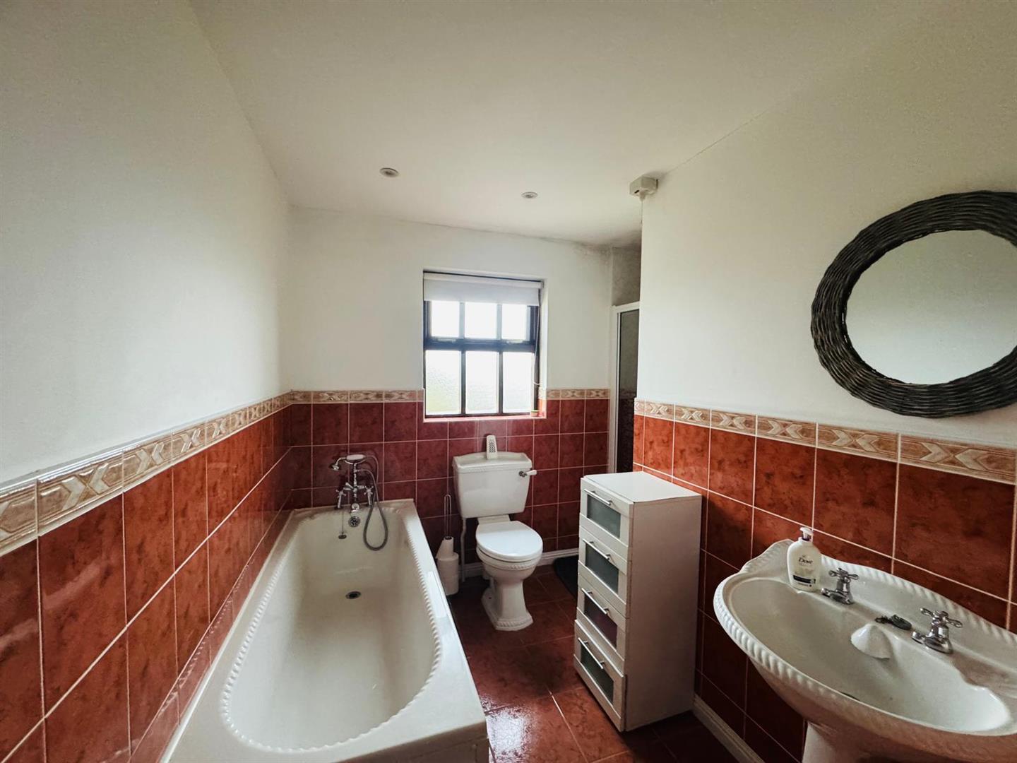 Comprising bath with shower attachment to taps, walk in electric shower, whb and wc, recessed lighting, 1/2 tiled walls, tiled floor.