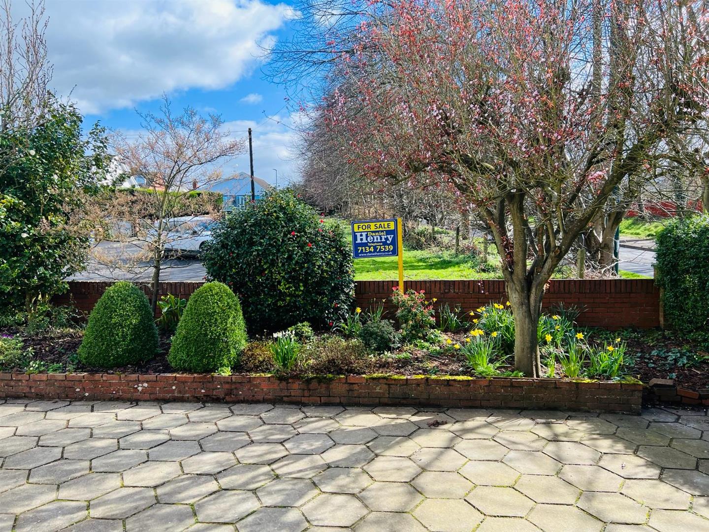 Paved area to front bordered by flower beds stocked with mature plants, shrubs and trees. Walled to front with double entrance gates.