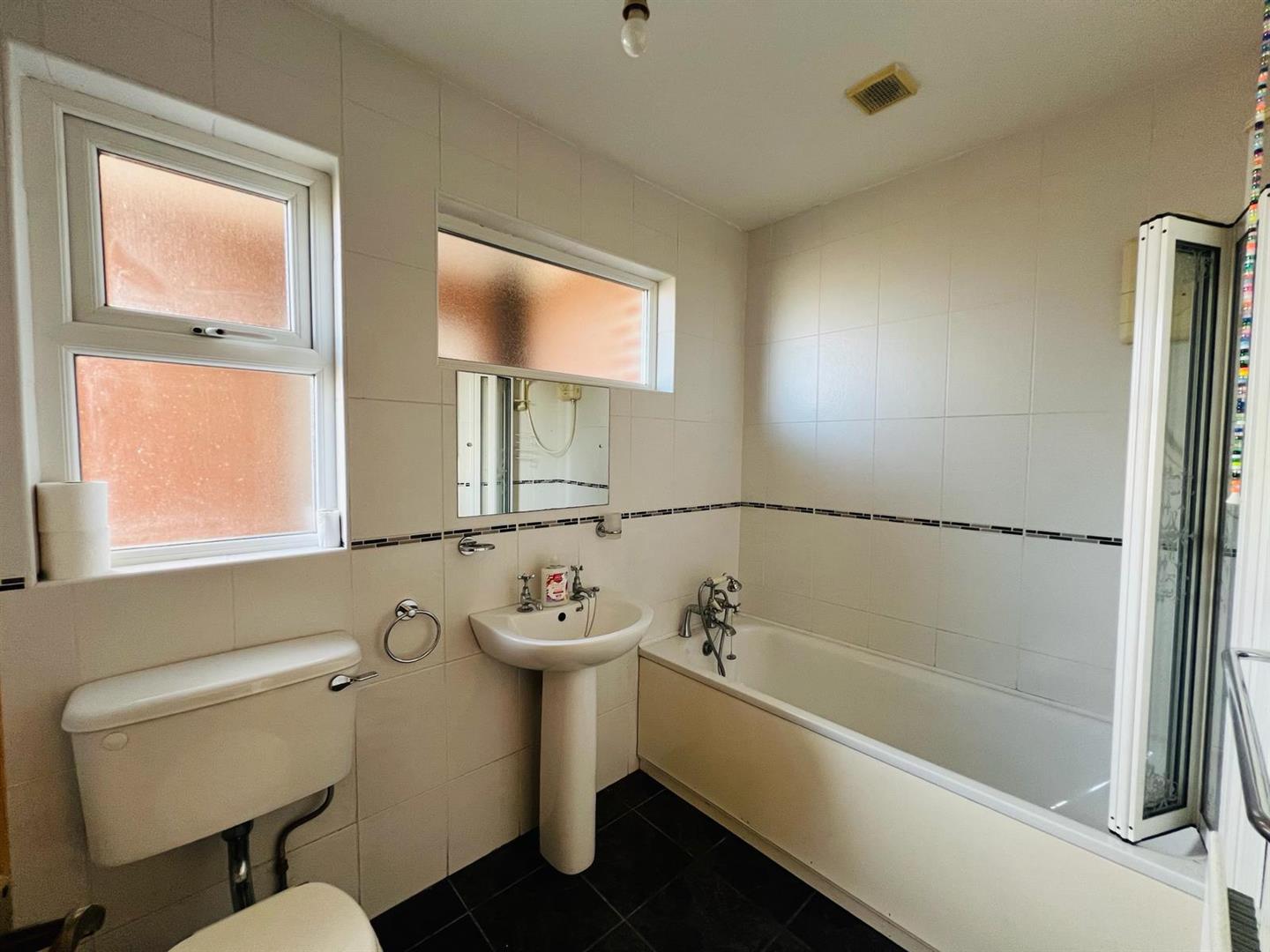 Comprising bath with telephone hand shower attachment to taps, shower screen, whb and wc, fully tiled walls and floor.