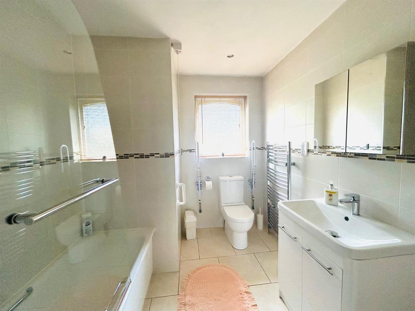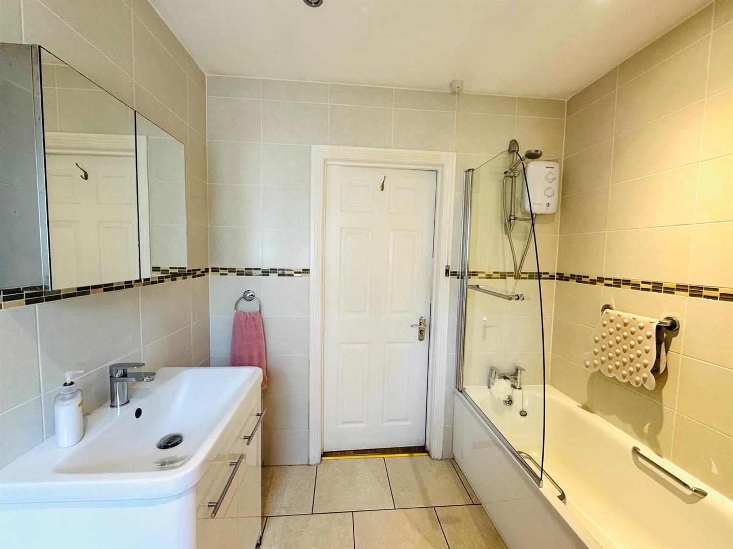 Comprising bath with electric shower over, shower screen, whb set in vanity unit, wc, recessed lighting, fully tiled walls and floor.