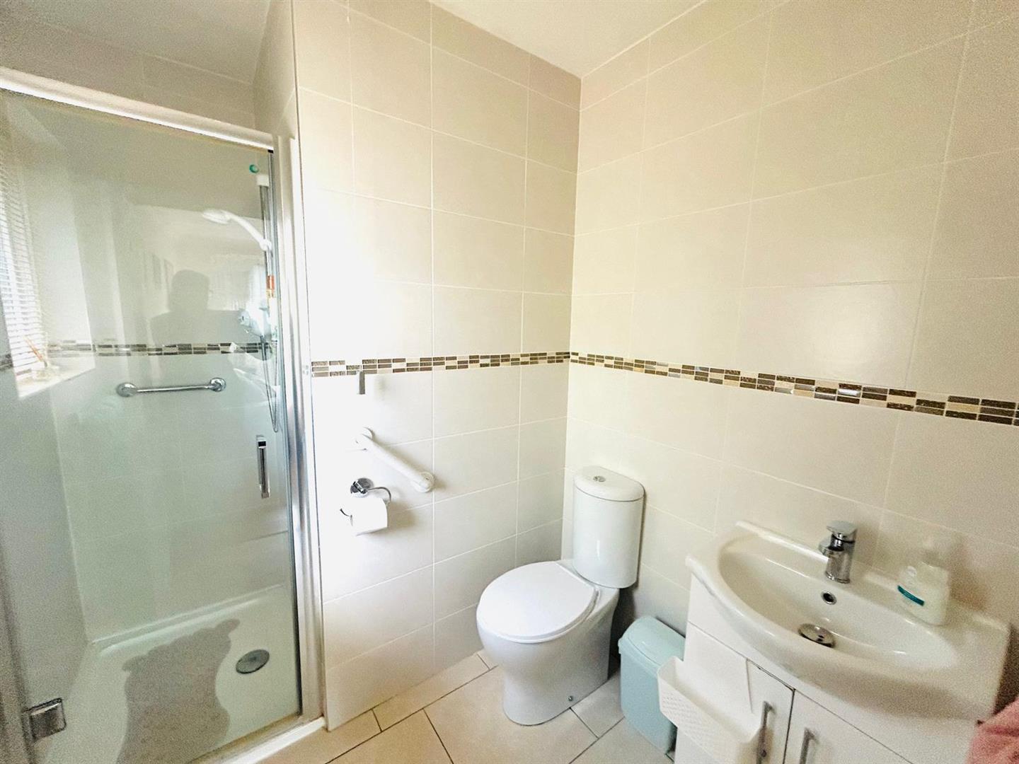 Comprising fully tiled walk in electric shower, whb set in vanity unit, wc, recessed lighting, fully tiled walls, tiled floor.