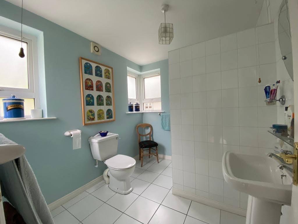Comprising bath with shower fitting to taps, walk in electric shower, whb and wc, tiled walls and floor.