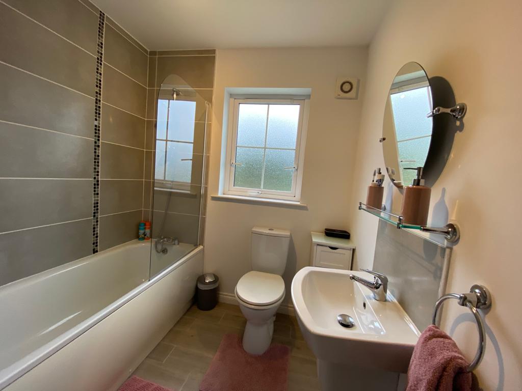 Comprising Bath with telephone hand shower to taps, shower screen, WHB and WC, tiling around bath, tiled floor.