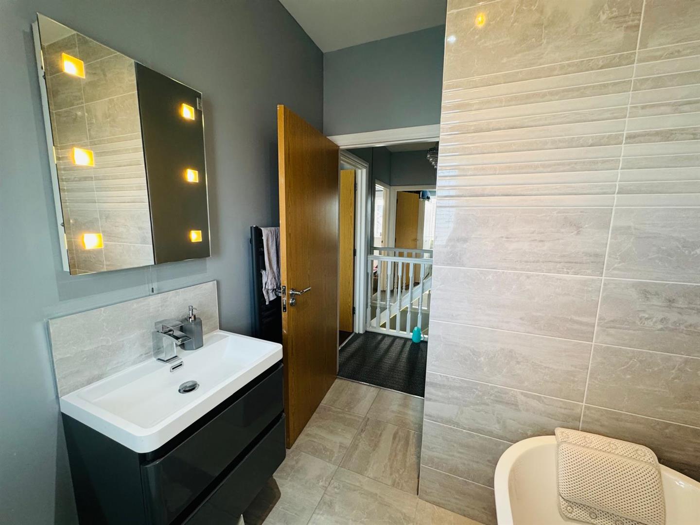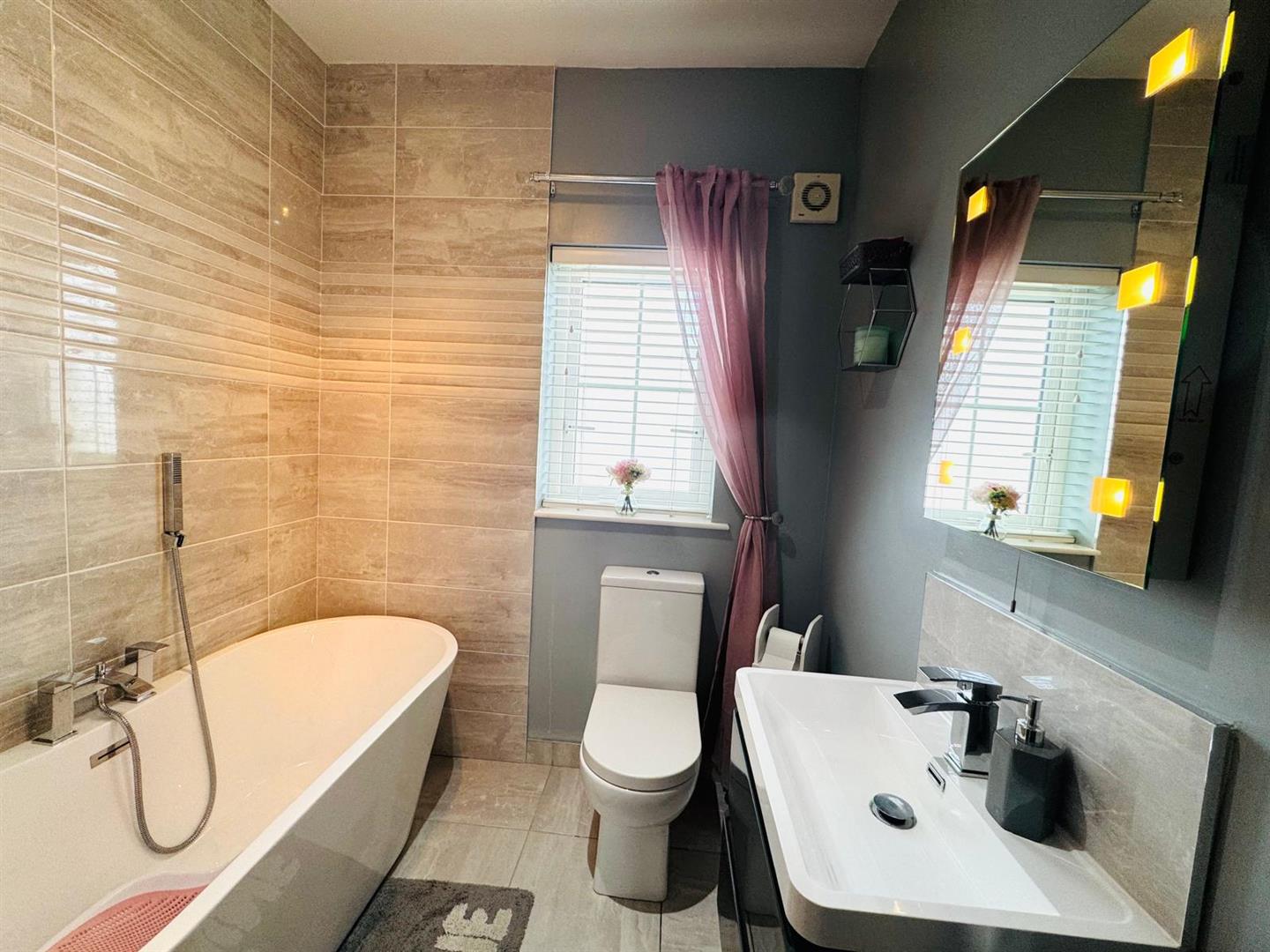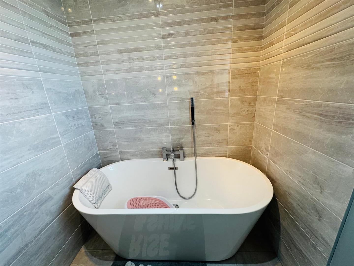 Comprising free standing bath with telephone hand shower attachment to taps and tiling around, whb set in vanity unit, wc, grey radiator, tiled floor.