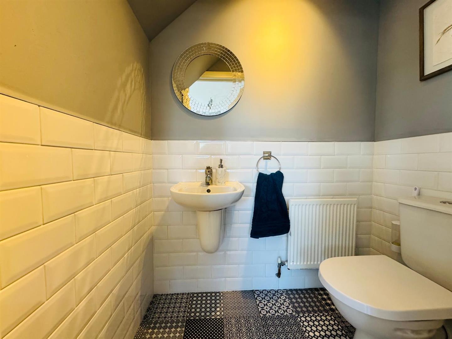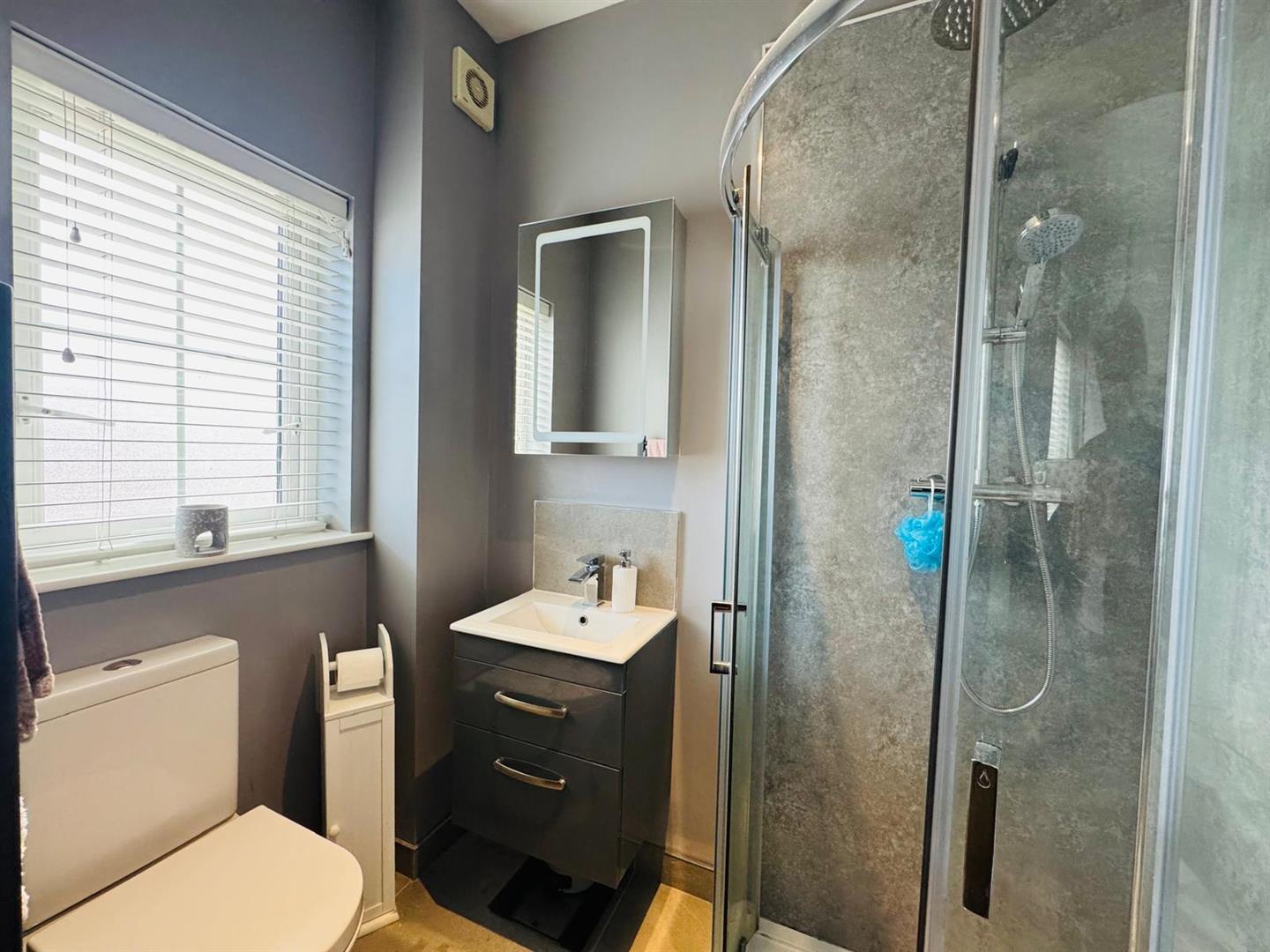 Comprising walk in shower with PVC cladding to walls, whb set in vanity unit, wc, grey wall radiator, tiled floor.