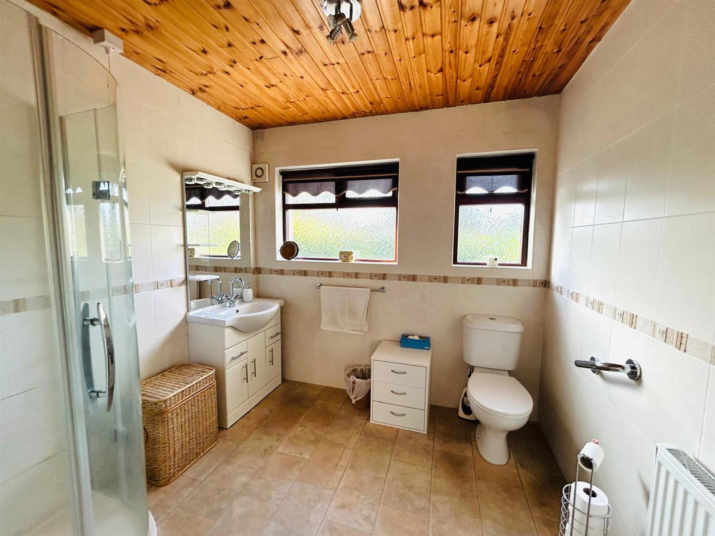 Comprising fully tiled walk in electric shower, whb with mixer taps set in vanity unit with storage, wc, wooden ceiling, fully tiled walls.