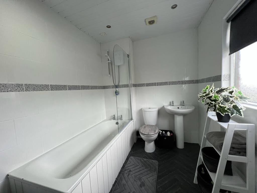 Comprising bath with electric shower over, shower screen, whb and wc, chrome radiator, recessed lighting, tiled walls.