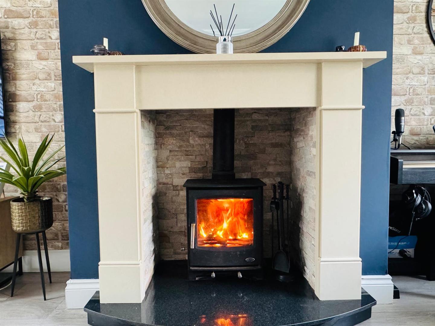 5.41m x 3.07m wp (17'9" x 10'1" wp) - Having attractive fireplace with tiled inset, multi fuel stove, granite hearth, ceiling cornicing, French doors to rear.