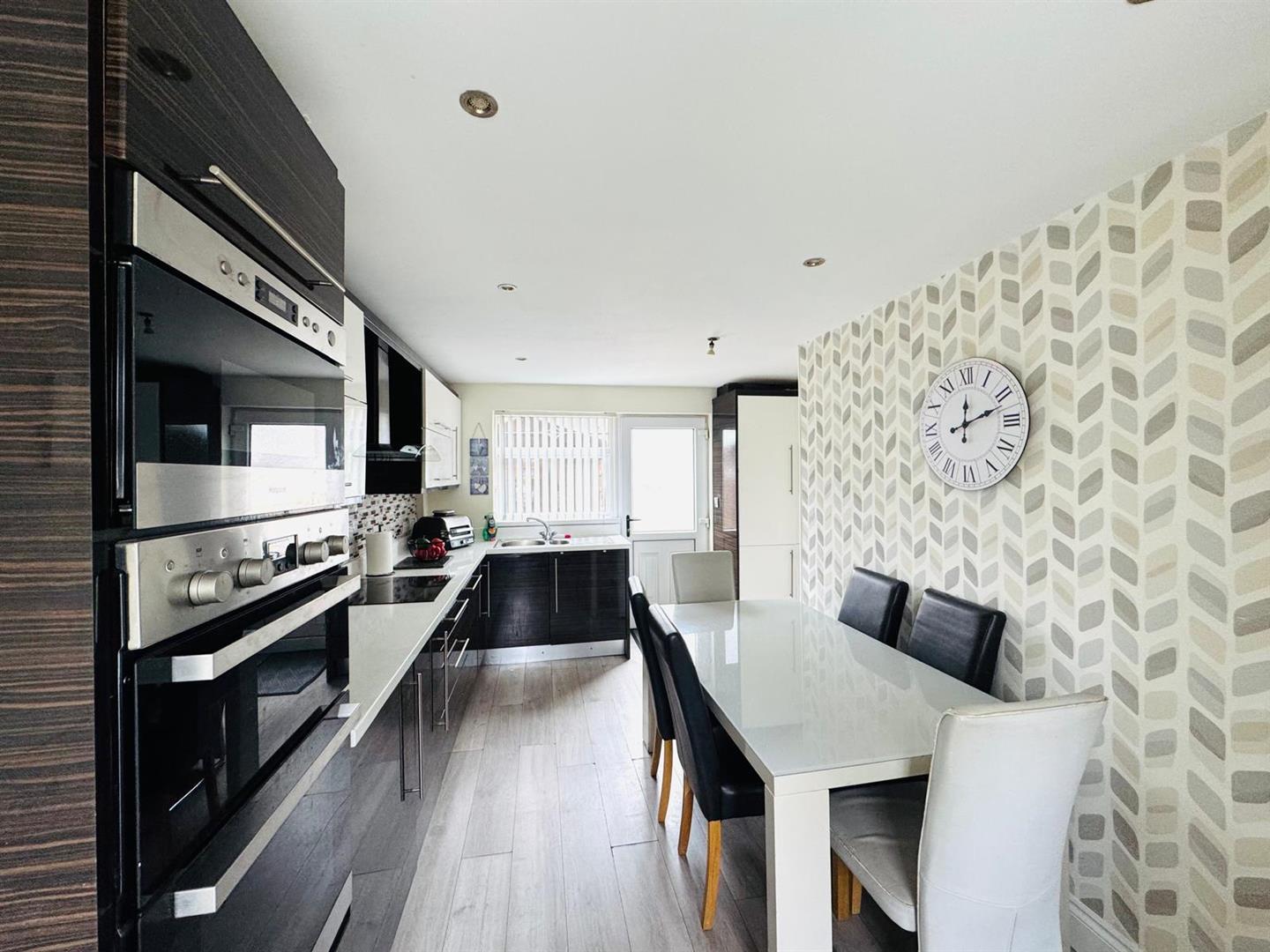 5.56m x 2.64m (18'3" x 8'8") - Having range of eye and low level units, hob, double oven, extractor hood, integrated microwave, dishwasher and fridge, dining space, understairs storage, recessed lighting, laminated wooden floor.