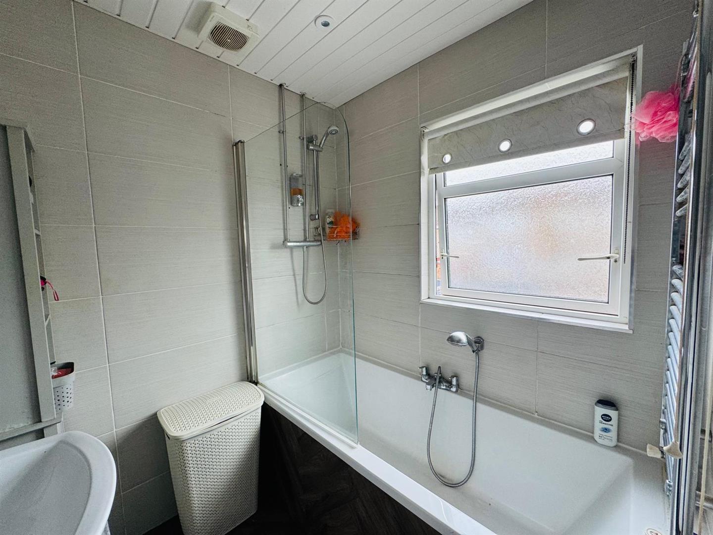 Comprising bath with shower over, shower screen, whb, chrome radiator, recessed lighting, tiled walls.