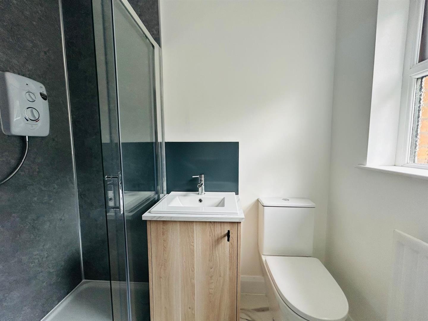 Comprising walk in electric shower with PVC cladding, whb with storage under, wc, extractor fan, laminated wooden floor.